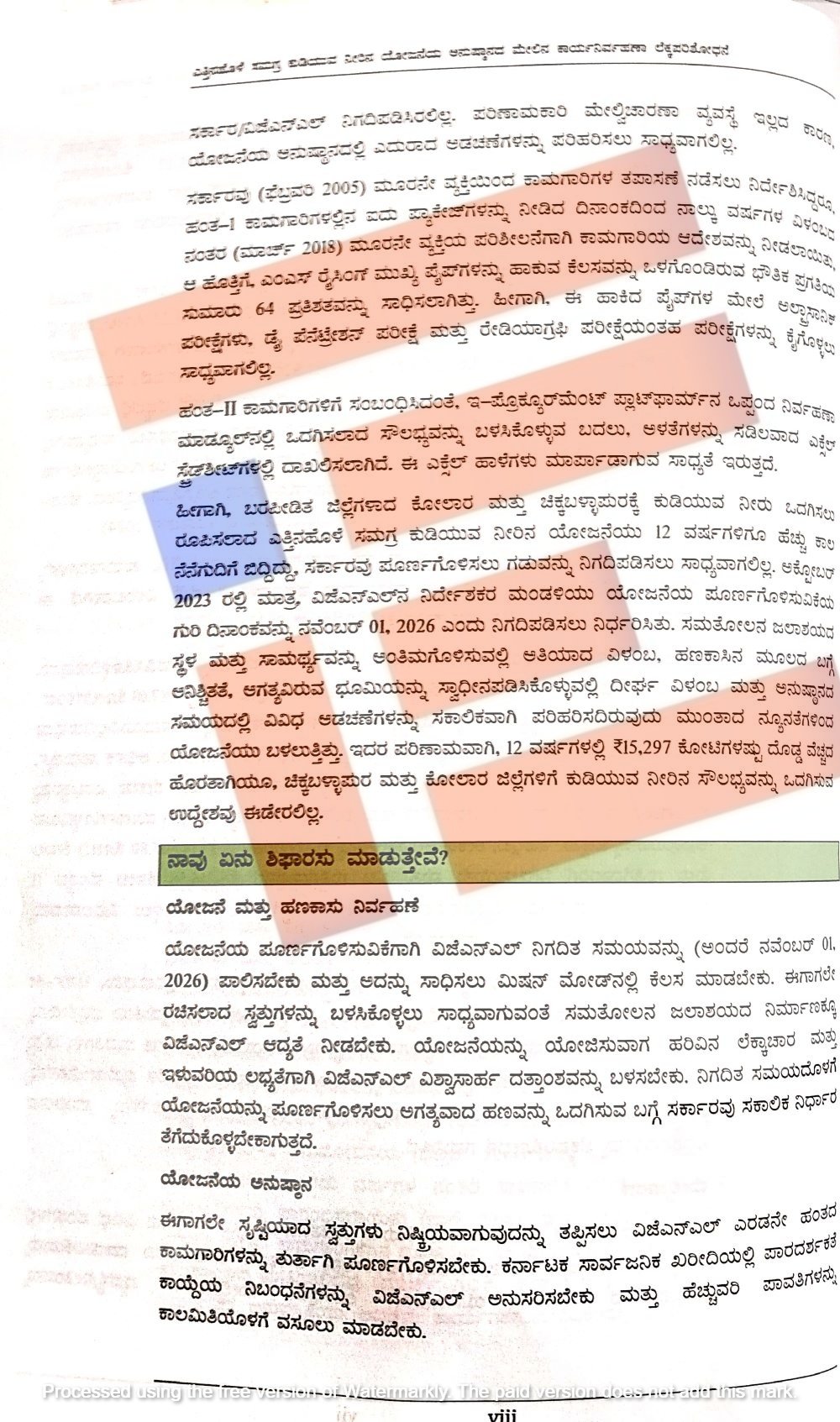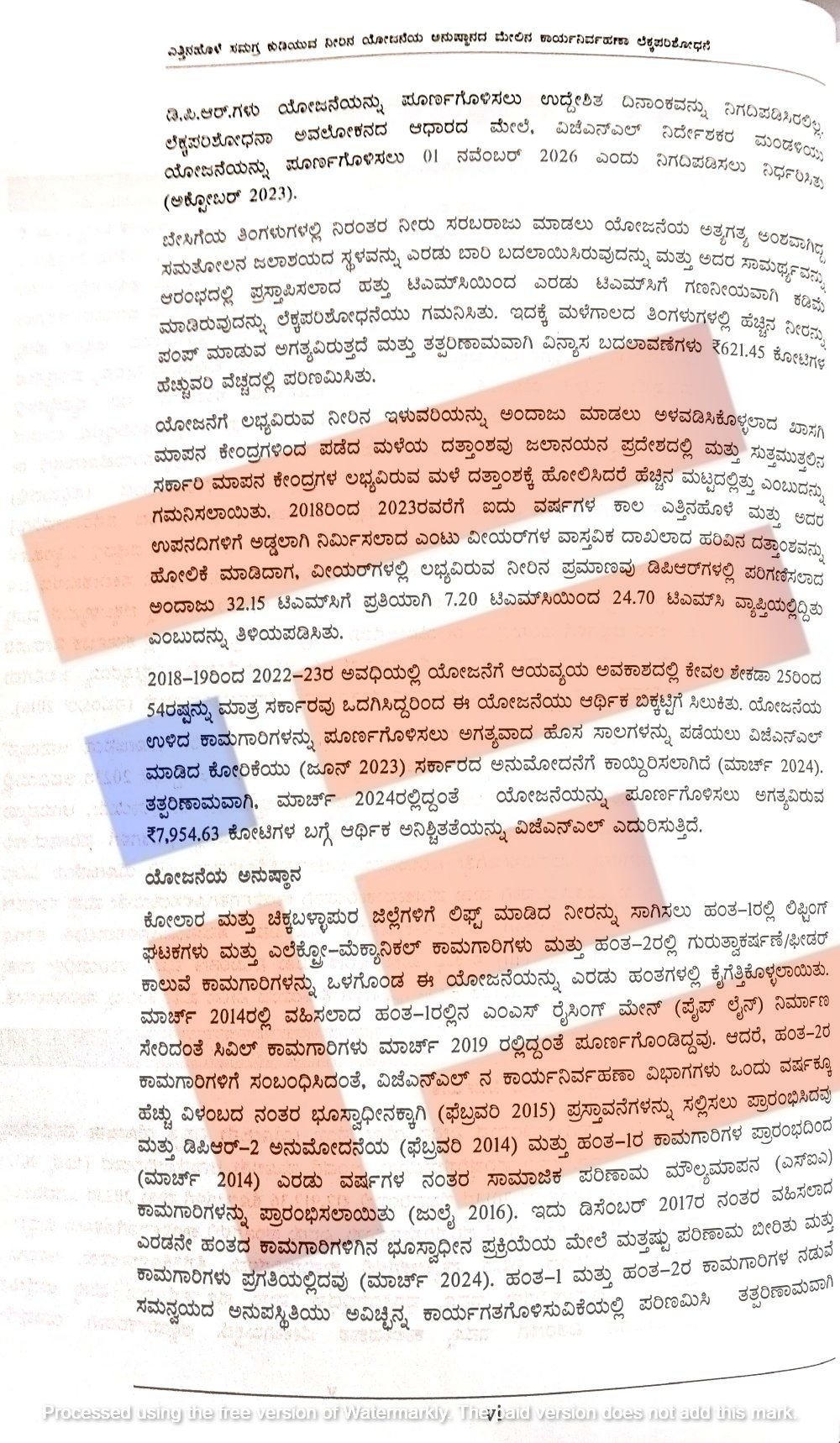 2018-19ರಿಂದ 2022-23ರ ಅವಧಿಯಲ್ಲಿ ಯೋಜನೆಗೆ ಆಯವ್ಯಯ ಅವಕಾಶದಲ್ಲಿ ಕೇವಲ ಶೆ. 25ರಿಂದ 54ರಷ್ಟನ್ನು ಮಾತ್ರ ಸರ್ಕಾರವು ಅನುದಾನ ಒದಗಿಸಿದೆ. ಹೀಗಾಗಿ ಈ ಯೋಜನೆಯು ಆರ್ಥಿಕ ಬಿಕ್ಕಟ್ಟಿಗೆ ಸಿಲುಕಿತು. ಯೋಜನೆಯ ಉಳಿದ ಕಾಮಗಾರಿಗಳನ್ನು ಪೂರ್ಣಗೊಳಿಸಲು ಅಗತ್ಯವಾದ ಹೊಸ ಸಾಲ ಪಡೆಯಲು ವಿಜೆಎನ್ಎಲ್ ಕೋರಿತ್ತು. 2024ರ ಮಾರ್ಚ್ವರೆಗೆ ಸರ್ಕಾರದ ಅನುಮೋದನೆಗೆ ಕಾಯ್ದಿರಿಸಲಾಗಿತ್ತು. ಹೀಗಾಗಿ 2024ರ ಮಾರ್ಚ್ನಲ್ಲಿದ್ದಂತೆ ಈ ಯೋಜನೆಯು ಪೂರ್ಣಗೊಳಿಸಲು ಅಗತ್ಯವಿರುವ 7,954.63 ಕೋಟಿ ರು.ಗಳ ಬಗ್ಗೆ ನಿಗಮವು ಆರ್ಥಿಕ ಅನಿಶ್ಚತೆಯಲ್ಲಿದೆ ಎಂದು ಸಿಎಜಿ ವರದಿಯಲ್ಲಿ ವಿವರಿಸಿದೆ.