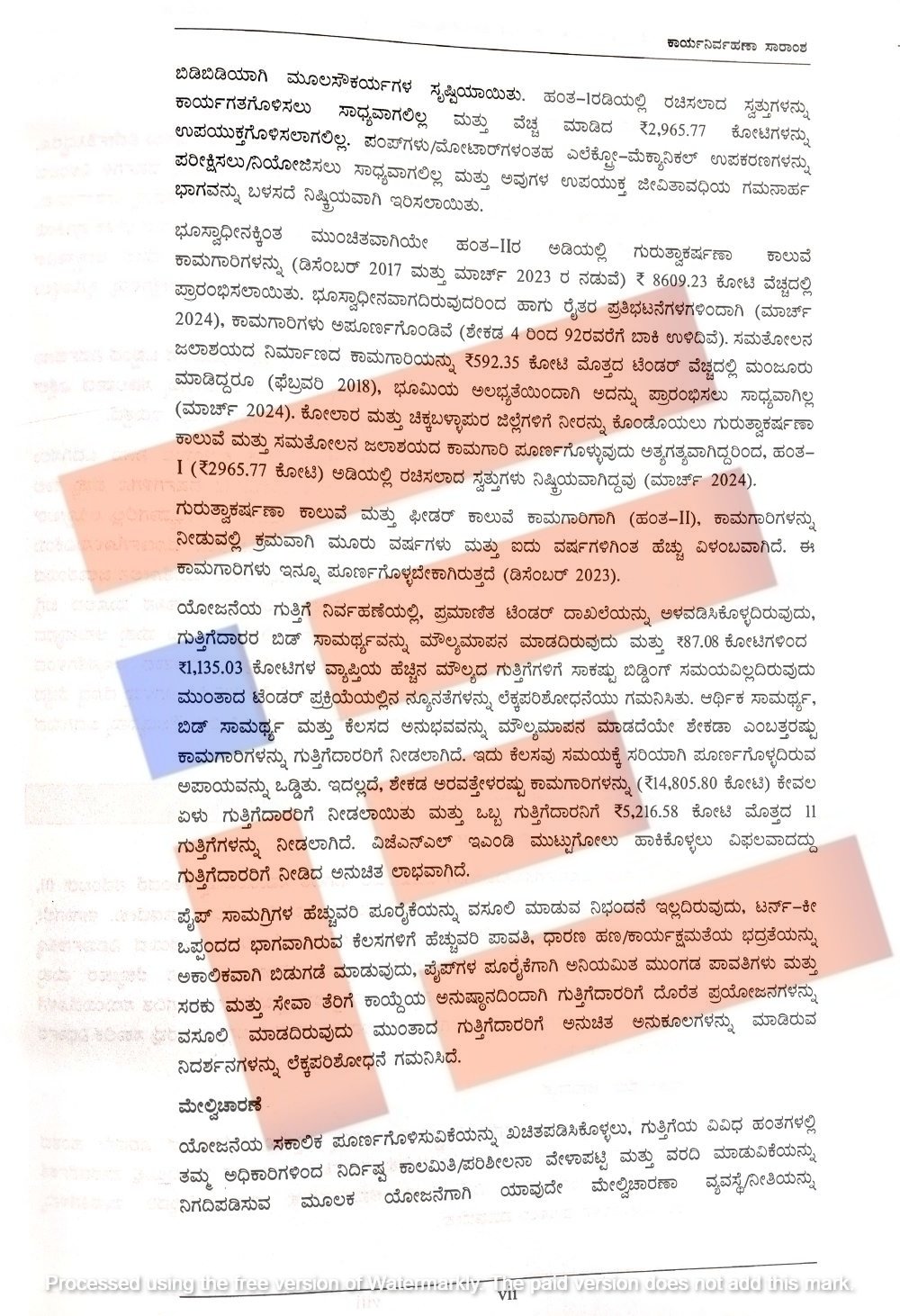 ಆರ್ಥಿಕ ಸಾಮರ್ಥ್ಯ, ಬಿಡ್ ಸಾಮರ್ಥ್ಯ ಮತ್ತು ಕೆಲಸದ ಅನುಭವವನ್ನೇ ಮೌಲ್ಯಮಾಪನ ಮಾಡಿರಲಿಲ್ಲ. ಆದರೂ ಶೇ.80ರಷ್ಟು ಕಾಮಗಾರಿಗಳನ್ನು ಅನನುಭವಿ, ಅಸಾಮರ್ಥ್ಯ ಗುತ್ತಿಗೆದಾರರಿಗೆ ನೀಡಲಾಗಿತ್ತು. ಹೀಗಾಗಿಯೇ ಯೋಜನೆಗಳ ಕಾಮಗಾರಿಗಳು ಸರಿಯಾದ ಸಮಯಕ್ಕೆ ಪೂರ್ಣಗೊಂಡಿಲ್ಲ. ಅಲ್ಲದೇ 14,805.80 ಕೋಟಿಯಷ್ಟು ಮೊತ್ತದ ಶೇ.67ರಷ್ಟು ಕಾಮಗಾರಿಗಳನ್ನು ಕೇವಲ 7 ಮಂದಿ ಗುತ್ತಿಗೆದಾರರಿಗೆ ನೀಡಲಾಗಿತ್ತು. ಮತ್ತು ಒಬ್ಬೇ ಒಬ್ಬ ಗುತ್ತಿಗೆದಾರನಿಗೆ 5,216.58 ಕೋಟಿ ರು ಮೊತ್ತದ 11 ಗುತ್ತಿಗೆಗಳನ್ನು ನೀಡಲಾಗಿತ್ತು. ಈ ಪ್ರಕರಣದಲ್ಲಿ ವಿಜೆಎನ್ಎಲ್ ಇಎಂಡಿ ಮುಟ್ಟುಗೋಲು ಹಾಕಿಕೊಳ್ಳಲು ವಿಫಲವಾಯಿತು. ಇದರಿಂದಾಗಿ ಗುತ್ತಿಗೆದಾರರಿಗೆ ಅನುಚಿತ ಲಾಭವಾದಂತಾಗಿದೆ ಎಂದು ಸಿಎಜಿ ವರದಿಯು ಬಹಿರಂಗಗೊಳಿಸಿದೆ.