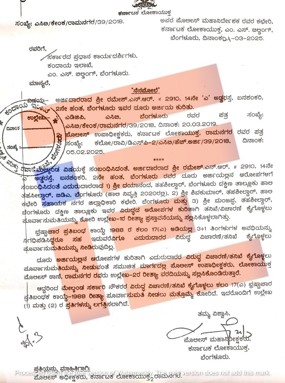 ದೂರರ್ಜಿಯಲ್ಲಿ ಉಲ್ಲೇಖಿಸಿರುವ  ಬೆಂಗಳೂರು ದಕ್ಷಿಣ ತಾಲೂಕಿನಲ್ಲಿ ಕಾರ್ಯನಿರ್ವಹಿಸಿದ್ದ ತಹಶೀಲ್ದಾರ್‍‌ಗಳ ವಿರುದ್ಧ ಆರೋಪಗಳ ಕುರಿತಾಗಿ ತನಿಖೆ, ವಿಚಾರಣೆ ಕೈಗೊಳ್ಳಲು ಪೂರ್ವಾನುಮತಿ ಕೋರಿ ಪ್ರಸ್ತಾವನೆ ಸಲ್ಲಿಸಲಾಗಿತ್ತು. ಭ್ರಷ್ಟಾಚಾರ ಪ್ರತಿಬಂಧಕ ಕಾಯ್ದೆ 1988ರ ಕಲಂ 17(ಎ) ಅಡಿಯಲ್ಲಿ ಪೂರ್ವಾನುಮತಿ ನೀಡಲು 4 ತಿಂಗಳ ಅವಧಿ ನಿಗದಿಪಡಿಸಿದೆ. ಆದರೆ ಇದುವರೆಗೂ ಎದುರುದಾರರ ವಿರುದ್ಧ ವಿಚಾರಣೆ, ತನಿಖೆ ಕೈಗೊಳ್ಳಲು ಪೂರ್ವಾನುಮತಿ ನೀಡಿಲ್ಲ ಎಂದು ಲೋಕಾಯುಕ್ತ ಪೊಲೀಸ್‌ ಮಹಾನಿರೀಕ್ಷಕರು 2025ರ ಮಾರ್ಚ್‌ 21ರಂದು ಬರೆದಿದ್ದ ನೆನಪೋಲೆಯಲ್ಲಿ ವಿವರಿಸಿದ್ದರು.