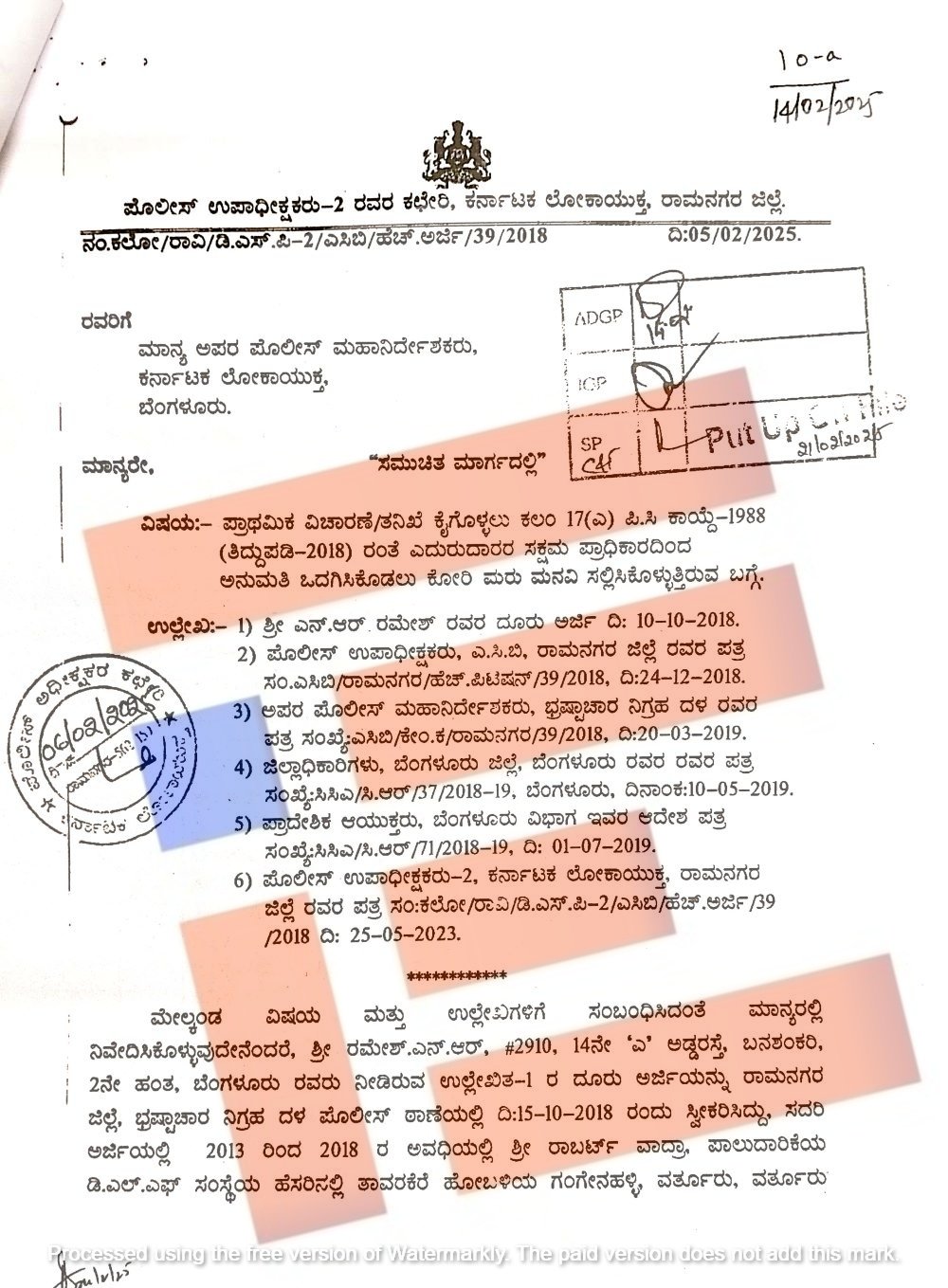 ಇದಾದ ನಂತರ ಲೋಕಾಯುಕ್ತದ ರಾಮನಗರ ಡಿವೈಎಸ್ಪಿ, ಎದುರುದಾರರ ವಿರುದ್ಧ ಪ್ರಾಥಮಿಕ ವಿಚಾರಣೆ, ತನಿಖೆ ಕೈಗೊಳ್ಳಲು ಭ್ರಷ್ಟಾಚಾರ ಕಾಯ್ದೆ 1988ರ (ತಿದ್ದುಪಡಿ 2018ರಂತೆ) ಕಲಂ 17(ಎ) ಅಡಿಯಲ್ಲಿ   ಸಕ್ಷಮ ಪ್ರಾಧಿಕಾರದಿಂದ ಅನುಮತಿ ಒದಗಿಸಿಕೊಡಬೇಕು ಎಂದು ಮರು ಮನವಿ ಮಾಡಿದ್ದರು.