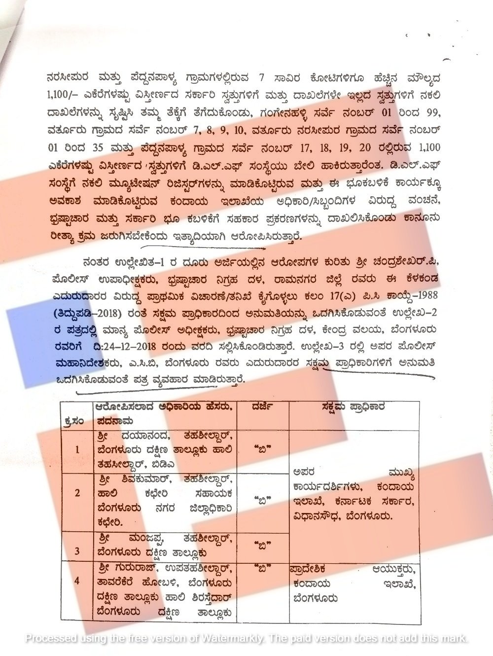 ಈ ಪೈಕಿ ಬೆಂಗಳೂರು ನಗರ ಜಿಲ್ಲಾಧಿಕಾರಿಗಳು ಕಂದಾಯ ನಿರೀಕ್ಷಕರಾದ ರವಿಕುಮಾರ್, ಗ್ರಾಮ ಲೆಕ್ಕಿಗರಾದ ಅಂಜನ್, ವಿಜಯಕುಮಾರ್ ಅವರ ವಿರುದ್ಧ ಪ್ರಾಥಮಿಕ ವಿಚಾರಣೆ ಕೈಗೊಳ್ಳಲು ಅನುಮತಿ ನೀಡಿದ್ದರು. ಅಲ್ಲದೇ ಬೆಂಗಳೂರು ವಿಭಾಗದ ಪ್ರಾದೇಶಿಕ ಆಯುಕ್ತರು, ತಾವರೆಕೆರೆ ಹೋಬಳಿಯ ಹಿಂದಿನ ಉಪ ತಹಶೀಲ್ದಾರ್ ಗುರುರಾಜ್‌ ಅವರ ವಿರುದ್ಧ ಪ್ರಾಥಮಿಕ ವಿಚಾರಣೆ ಕೈಗೊಳ್ಳಲು ಅನುಮತಿ ನೀಡಿದ್ದರು. ನಂತರ ಈ ದೂರರ್ಜಿಯ ವಿಚಾರಣೆಯು ಎಸಿಬಿಯಿಂದ ಲೋಕಾಯುಕ್ತದ ರಾಮನಗರ ಠಾಣೆಗೆ ವರ್ಗಾವಣೆಗೊಂಡಿತ್ತು.