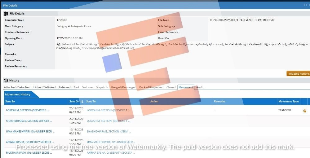 ಲೋಕಾಯುಕ್ತ ಮತ್ತು ಕಂದಾಯ ಇಲಾಖೆಯ ನಡುವೆ ಪತ್ರ ವ್ಯವಹಾರಗಳಲ್ಲಿಯೇ ಕಾಲಹರಣವಾಗಿದೆ. ಸದ್ಯ ಈ ಕಡತವು 2025ರ ಡಿಸೆಂಬರ್‍‌ 20ರಂದು ಕಂದಾಯ ಇಲಾಖೆಯ ವಿಭಾಗದ ಲಾಗಿನ್‌ನಲ್ಲಿರುವುದು ಗೊತ್ತಾಗಿದೆ.