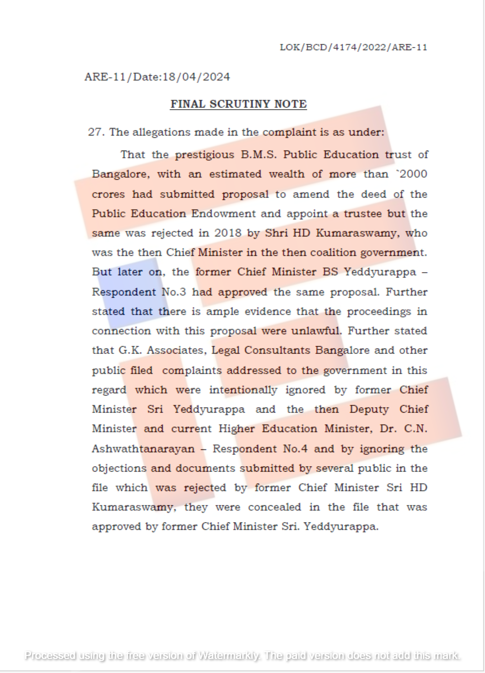 ಬಿಎಂಎಸ್ ಶಿಕ್ಷಣ ದತ್ತಿಯ ಟ್ರಸ್ಟ್ ಡೀಡ್ ತಿದ್ದುಪಡಿ ಪ್ರಸ್ತಾವನೆಗೆ ಸಂಬಂಧಿಸಿದಂತೆ 2018ರಲ್ಲಿಯೇ ಕಡತ (ED 124TEC 2018) ಸೃಷ್ಟಿಯಾಗಿತ್ತು. ಇದೇ ಕಡತದಲ್ಲಿ ಪ್ರಸ್ತಾವನೆಯು ಕಾನೂನುಬಾಹಿರವಾಗಿದೆ ಎಂದು ಲಿಖಿತ ಆಕ್ಷೇಪಣೆಗಳು ಸಲ್ಲಿಕೆಯಾಗಿದ್ದವು. ಹೀಗಾಗಿ ಹಿಂದಿನ ಮುಖ್ಯಮಂತ್ರಿ ಎಚ್ ಡಿ ಕುಮಾರಸ್ವಾಮಿ ಅವರು ಈ ಪ್ರಸ್ತಾವನೆಯನ್ನು ತಿರಸ್ಕರಿಸಿದ್ದರು.