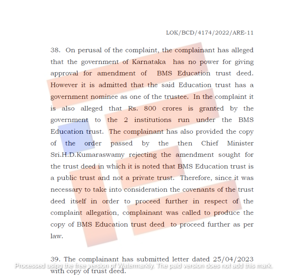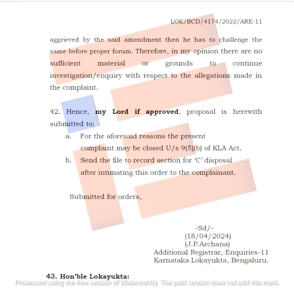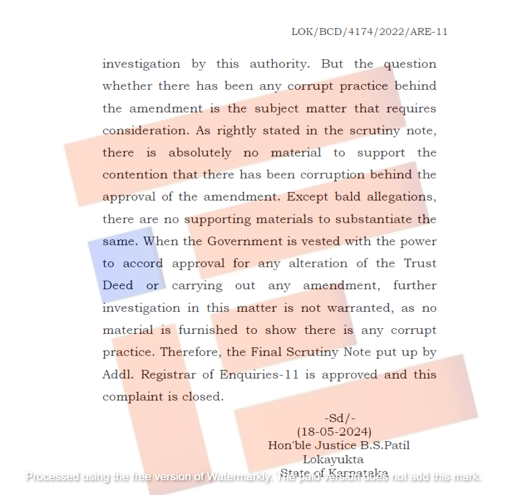 ಈ ದೂರನ್ನು ವಿಚಾರಣೆ ನಡೆಸಿದ್ದ ಲೋಕಾಯುಕ್ತ ಹೆಚ್ಚುವರಿ ನಿಬಂಧಕರು (11) ನೀಡಿದ್ದ ಅಂತಿಮ ಪರಿಶೀಲನಾ ಟಿಪ್ಪಣಿಯನ್ನು ಲೋಕಾಯುಕ್ತ ಬಿ ಎಸ್ ಪಾಟೀಲ್ ಅವರು ಅನುಮೋದಿಸಿದ್ದಾರೆ.