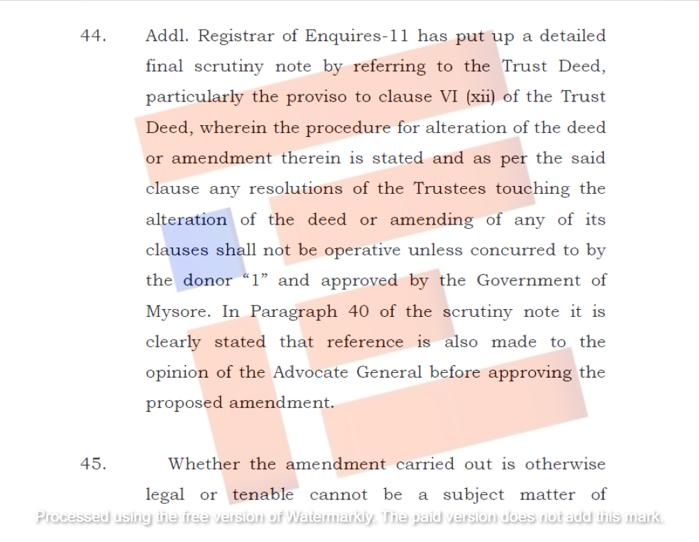 ಟ್ರಸ್ಟ್ ಡೀಡ್ನ ಒಡಂಬಡಿಕೆಗಳನ್ನು ಪರಿಶೀಲಿಸಿದ ನಂತರ ಮೂಲ ಟ್ರಸ್ಟ್ ಡೀಡ್ನ ಪ್ಯಾರಾ VI (xii) ಗೆ ಹೇಳಲಾದ ನಿಬಂಧನೆಯನ್ನು ಗಮನದಲ್ಲಿಟ್ಟುಕೊಂಡಿದೆ. ಡೀಡ್ನ ಯಾವುದೇ ಬದಲಾವಣೆ ಅಥವಾ ತಿದ್ದುಪಡಿಗೆ ಒಪ್ಪಿಗೆ ನೀಡುವ ಅಧಿಕಾರವನ್ನು ಸರ್ಕಾರ ಹೊಂದಿದೆ. ದೂರುದಾರರು ಸಲ್ಲಿಸಿದ ದಾಖಲೆಗಳು, ಟ್ರಸ್ಟ್ ಡೀಡ್ನ ತಿದ್ದುಪಡಿಗೆ ಅನುಮೋದನೆ ನೀಡುವ ಮೊದಲು ಸರ್ಕಾರವು ಕಾನೂನು ಇಲಾಖೆಯ ಅಭಿಪ್ರಾಯವನ್ನು ತೆಗೆದುಕೊಂಡಿದೆ ಎಂದು ತೋರಿಸುತ್ತದೆ ಎಂದು ಆದೇಶದಲ್ಲಿ ವಿವರಿಸಿದೆ.