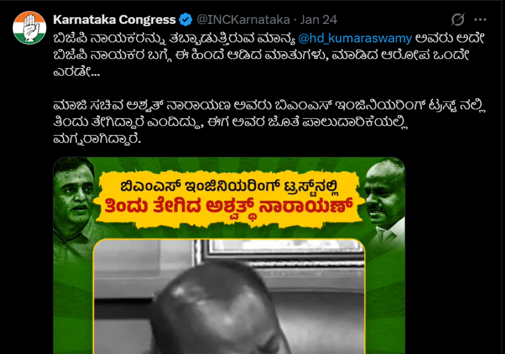 ಬಿಎಂಎಸ್ ಎಜುಕೇಷನಲ್ ಟ್ರಸ್ಟ್ಗೆ ಸಂಬಂಧಿಸಿದ ಸ್ವತ್ತುಗಳನ್ನು ಜಾರಿ ನಿರ್ದೇಶನಾಲಯವು ಮುಟ್ಟುಗೋಲು ಹಾಕಿಕೊಂಡಿದೆ. ಇದರ ಬೆನ್ನಲ್ಲೇ ಕರ್ನಾಟಕ ಪ್ರದೇಶ ಕಾಂಗ್ರೆಸ್ ಸಮಿತಿಯೂ ಸಹ ಎಚ್ ಡಿ ಕುಮಾರಸ್ವಾಮಿ ಅವರನ್ನು ಲೇವಡಿ ಮಾಡಿತ್ತು. ‘ಬಿಜೆಪಿ ನಾಯಕರನ್ನು ತಬ್ಬಾಡುತ್ತಿರುವ ಕುಮಾರಸ್ವಾಮಿ ಅವರು ಅದೇ ಬಿಜೆಪಿ ನಾಯಕರ ಬಗ್ಗೆ ಈ ಹಿಂದೆ ಆಡಿದ ಮಾತುಗಳು, ಮಾಡಿದ ಆರೋಪ ಒಂದೇ ಎರಡೇ, ಮಾಜಿ ಸಚಿವ ಅಶ್ವತ್ ನಾರಾಯಣ ಅವರು ಬಿಎಂಎಸ್ ಇಂಜಿನಿಯರಿಂಗ್ ಟ್ರಸ್ಟ್ ನಲ್ಲಿ ತಿಂದು ತೇಗಿದ್ದಾರೆ ಎಂದಿದ್ದು ಈಗ ಅವರ ಜೊತೆ ಪಾಲುದಾರಿಕೆಯಲ್ಲಿ ಮಗ್ನರಾಗಿದ್ದಾರೆ,’ ಎಂದು ಟ್ವೀಟ್ ಮಾಡಿತ್ತು.