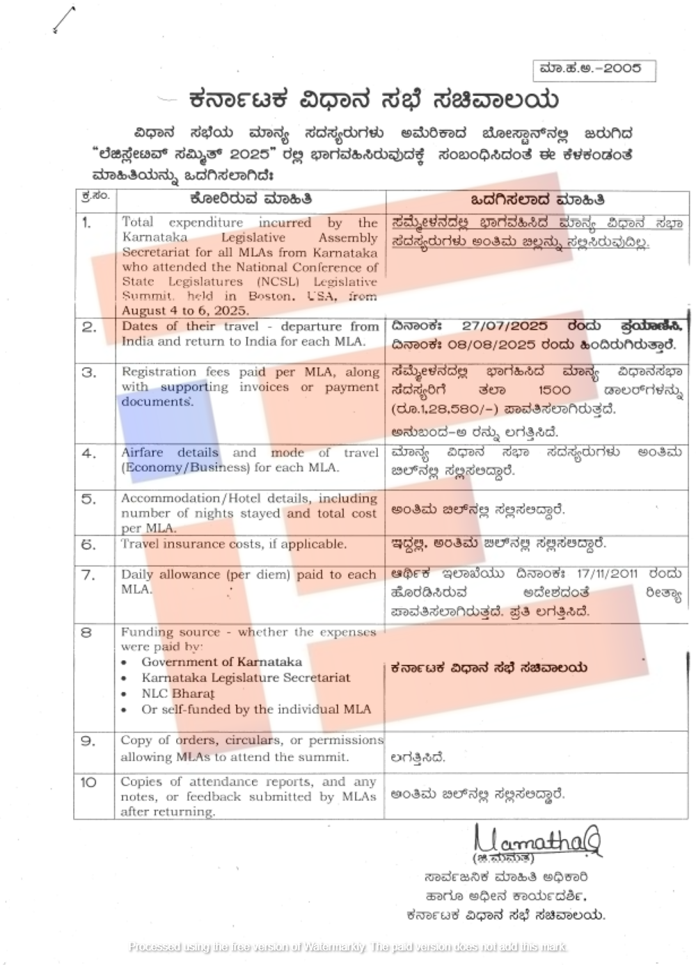 ಉಳಿದಂತೆ ಕರ್ನಾಟಕ ವಿಧಾನ ಸಭೆ ಸಚಿವಾಲಯವೇ ಇತರೆ ವೆಚ್ಚ ಭರಿಸಿದೆ. ಸಮ್ಮೇಳನದಲ್ಲಿ ಭಾಗವಹಿಸಿದ ಹಾಜರಾತಿ, ವರದಿಗಳು, ಪ್ರತಿಕ್ರಿಯೆಗಳು ಇತರೆ ಎಲ್ಲವನ್ನೂ ಅಂತಿಮ ಬಿಲ್ನಲ್ಲಿ ಸಲ್ಲಿಸಲಿದ್ದಾರೆ ಎಂದು ಮಾಹಿತಿ ಒದಗಿಸಿದ್ದರು. ದಿನಭತ್ಯೆ ಪಾವತಿ ಕುರಿತು 2011ರ ನವೆಂಬರ್ 17ರಂದೇ ಆರ್ಥಿಕ ಇಲಾಖೆಯು ಸುತ್ತೋಲೆ ಹೊರಡಿಸಿದೆ. ಆದರೂ ಈ ಸುತ್ತೋಲೆ ಪ್ರಕಾರ ಶಾಸಕರು ವಾಸ್ತವ ವೆಚ್ಚಗಳನ್ನು ಒದಗಿಸಬೇಕಿತ್ತು. ಆದರೆ ಐದಾರು ತಿಂಗಳಾದರೂ ಸಹ ಯಾವುದೇ ಮಾಹಿತಿ ಒದಗಿಸಿಲ್ಲ. ಅಲ್ಲದೆ ಮುಂಗಡ ಪಾವತಿ ಸಂಬಂಧ ಯಾವುದೇ ಕರ್ನಾಟಕ ವಿಧಾನಸಭೆ ಸಚಿವಾಲಯವು ಮಾಹಿತಿ ನೀಡಿಲ್ಲ.