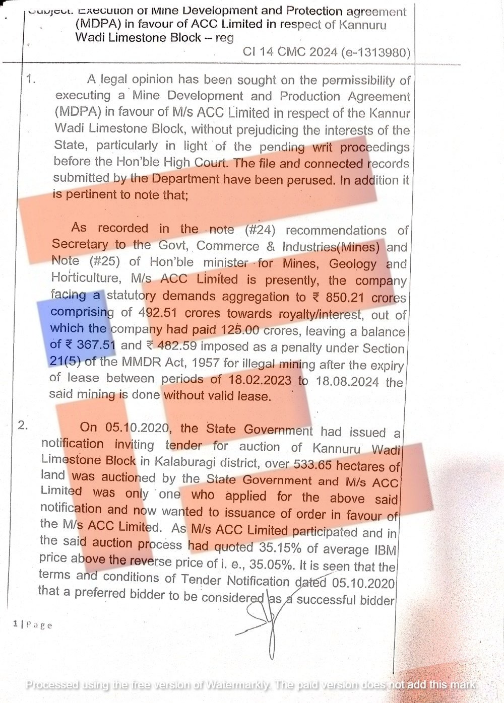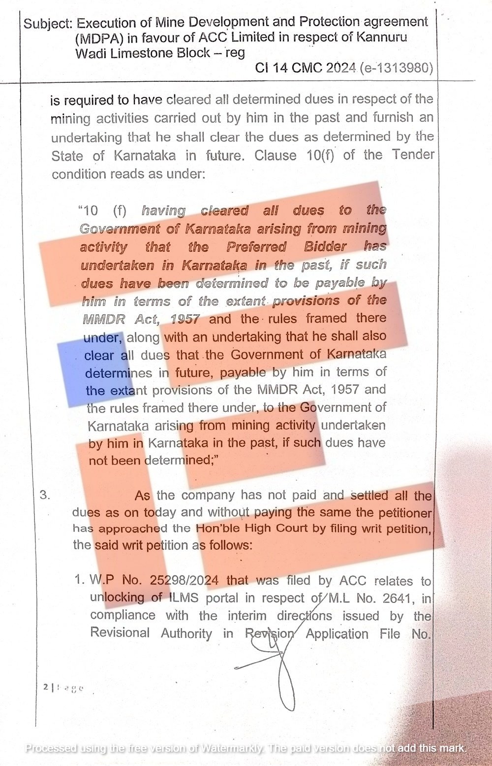 ಎಸಿಸಿ ಲಿಮಿಟೆಡ್ ನ್ಯಾಯಾಲಯದಲ್ಲಿ ಸಲ್ಲಿಸಿರುವ ರಿಟ್ ಅರ್ಜಿಗಳನ್ನೂ ಕಾನೂನು ಇಲಾಖೆಯು ಅವಲೋಕಿಸಿದೆ. ಈ ಅರ್ಜಿಗಳೂ ಇನ್ನೂ ನ್ಯಾಯಾಲಯದಲ್ಲಿ ವಿಚಾರಣೆ ಹಂತದಲ್ಲಿದೆ ಎಂಬ ಅಂಶವನ್ನು ಉಲ್ಲೇಖಿಸಿರುವ ಕಾನೂನು ಇಲಾಖೆಯು, ಕಂಪನಿಯು ಅಧಿಸೂಚನೆಯ 10(ಎಫ್) ನಲ್ಲಿನ ಷರತ್ತುಗಳನ್ನು ಪಾಲಿಸಿಲ್ಲ. ಅಲ್ಲದೇ ಎಸಿಸಿ ಲಿಮಿಟೆಡ್ ಗೆ ಮತ್ತೊಂದು 50 ವರ್ಷಗಳ ಗುತ್ತಿಗೆಯೊಂದಿಗೆ ಮುಂದುವರಿಯುವುದು ರಾಜ್ಯ ಹಿತಾಸಕ್ತಿಯಾಗುವುದಿಲ್ಲ ಅಥವಾ 50 ವರ್ಷಗಳ ಗುತ್ತಿಗೆಯೊಂದಿಗೆ ಮುಂದುವರೆಯುವುದು ವಿವೇಕಯುತವೂ ಅಲ್ಲ ಎಂದು ಕಾನೂನು ಇಲಾಖೆಯು ಸ್ಪಷ್ಟವಾಗಿ ಹೇಳಿದೆ.