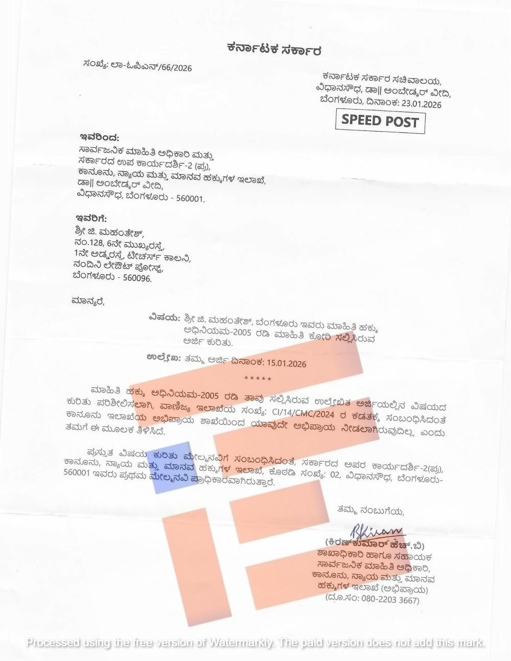 ಈ ಅರ್ಜಿಗೆ ಕಾನೂನು ಇಲಾಖೆಯು (ಅಭಿಪ್ರಾಯ) 2026 ಜನವರಿ 23ರಂದು ಉತ್ತರಿಸಿದೆ. ಅಚ್ಚರಿ ಎಂದರೇ ಈ ಕಡತಕ್ಕೆ ಸಂಬಂಧಿಸಿದಂತೆ ಕಾನೂನು ಇಲಾಖೆಯ ಅಭಿಪ್ರಾಯ ಶಾಖೆಯಿಂದ ಯಾವುದೇ ಅಭಿಪ್ರಾಯ ನೀಡಲಾಗಿರುವುದಿಲ್ಲ ಎಂದು ಉತ್ತರಿಸಿದೆ.