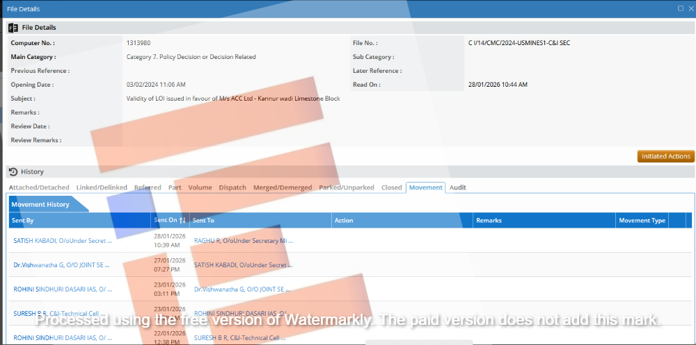 ವಿಶೇಷವೆಂದರೇ ಈ ಕಡತವು (ಕಡತ ಸಂಖ್ಯೆ; CI/14/CMC/2024) 2025ರ ಡಿಸೆಂಬರ್ 29ರಂದು ಕೈಗಾರಿಕೆ ಮತ್ತು ವಾಣಿಜ್ಯ ಇಲಾಖೆ (ಗಣಿ) ಸರ್ಕಾರದ ಕಾರ್ಯದರ್ಶಿ ರೋಹಿಣಿ ಸಿಂಧೂರಿ ಅವರ ಲಾಗಿನ್ನಿಂದ (2;17 pm) ಕಾನೂನು, ನ್ಯಾಯ ಮತ್ತು ಮಾನವ ಹಕ್ಕುಗಳ ಇಲಾಖೆಯ ಸರ್ಕಾರದ ಪ್ರಧಾನ ಕಾರ್ಯದರ್ಶಿ ನೇರಳೆ ವೀರಭದ್ರಯ್ಯ ಭವಾನಿ ಅವರ ಲಾಗಿನ್ ತೋರಿಸಿದೆ.