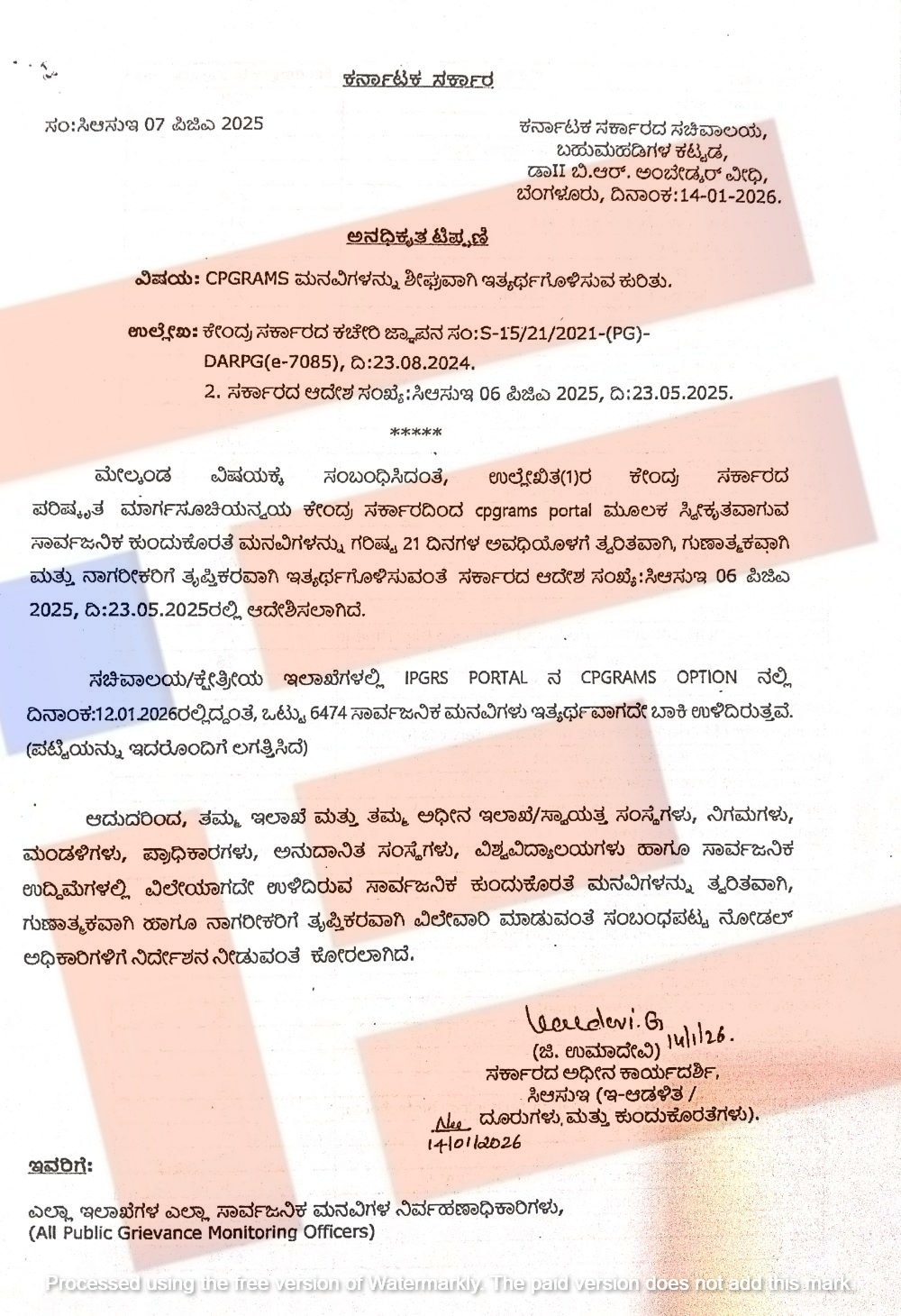 ಬೆಂಗಳೂರು; ಸಾರ್ವಜನಿಕರು ಕೇಂದ್ರೀಕೃತ ಸಾರ್ವಜನಿಕ ಕುಂದುಕೊರತೆ ಪರಿಹಾರ ಮತ್ತು ಮೇಲ್ವಿಚಾರಣಾ ವ್ಯವಸ್ಥೆ ಕೇಂದ್ರ ಮತ್ತು ರಾಜ್ಯ ಸರ್ಕಾರಗಳೆರಡರಲ್ಲೂ ಸರ್ಕಾರಿ ಸೇವೆಗಳಿಗೆ ಸಂಬಂಧಿಸಿದಂತೆ ಸಲ್ಲಿಸುವ ಕುಂದುಕೊರತೆಗಳ ಅರ್ಜಿಗಳು ಸಕಾಲದಲ್ಲಿ ವಿಲೇವಾರಿ ಆಗುತ್ತಿಲ್ಲ. 2026ರ ಜನವರಿ 12ರ ಅಂತ್ಯಕ್ಕೆ ರಾಜ್ಯದಲ್ಲಿ ಒಟ್ಟಾರೆ 6,474 ಸಾರ್ವಜನಿಕರ ಮನವಿಗಳು ಇತ್ಯರ್ಥವಾಗದೇ ಬಾಕಿ ಉಳಿದಿವೆ.