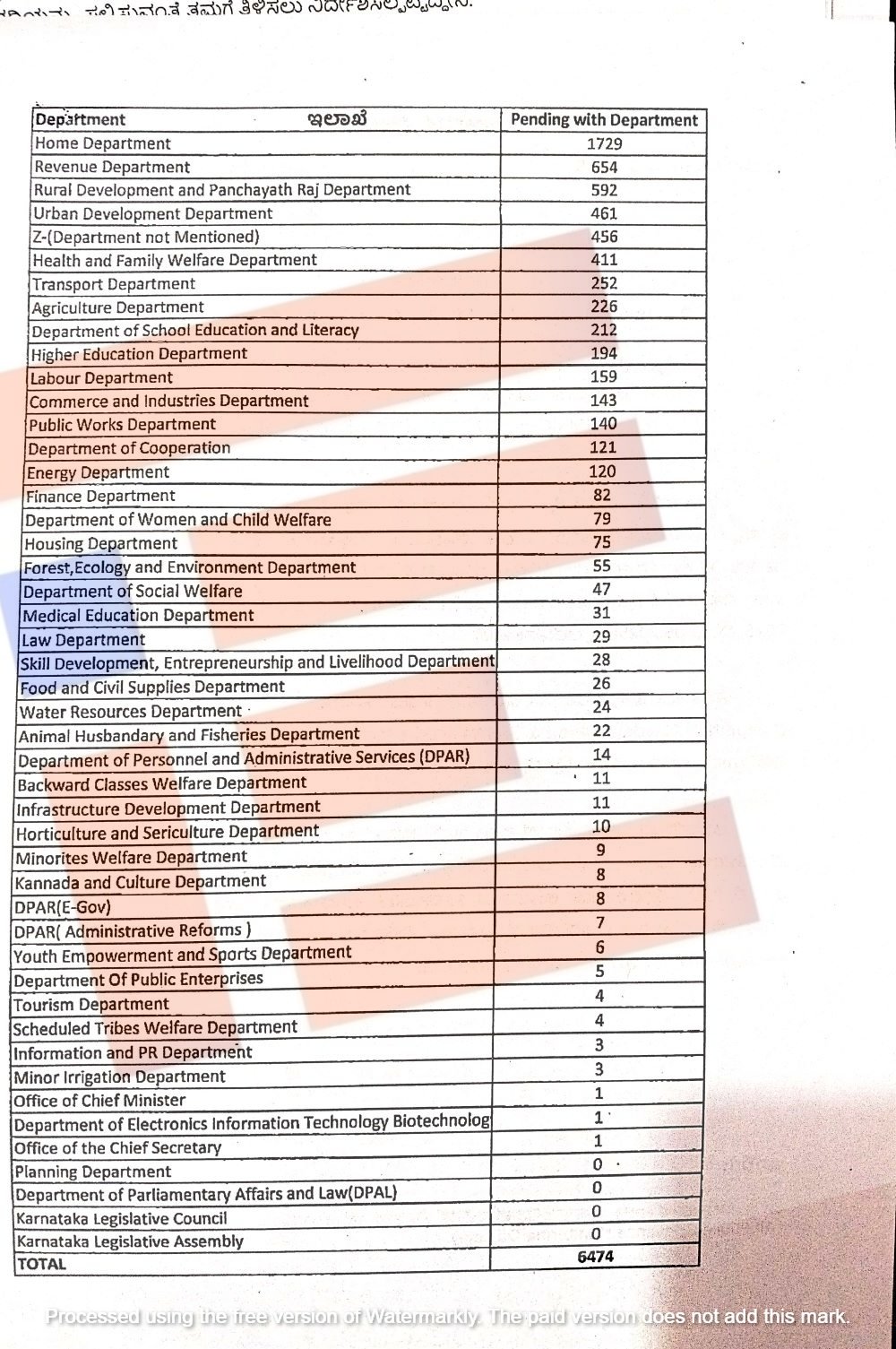ಇತ್ಯರ್ಥವಾಗದೇ ಬಾಕಿ ಇರುವ 6,474 ಮನವಿಗಳ ಪೈಕಿ ಗೃಹ ಇಲಾಖೆಯಲ್ಲಿಯೇ ಅತೀ ಹೆಚ್ಚು ಎಂದರೇ 1,729 ಮನವಿಗಳು ಇತ್ಯರ್ಥಕ್ಕಾಗಿ ಬಾಕಿ ಇವೆ. ಅಲ್ಲದೇ ಉಳಿದ ಇಲಾಖೆಗಳಿಗಿಂತಲೂ ಗೃಹ ಇಲಾಖೆಯಲ್ಲಿಯೇ ಅತೀ ಹೆಚ್ಚು ಬಾಕಿ ಇರುವುದು ಪತ್ರದಿಂದ ತಿಳಿದು ಬಂದಿದೆ.