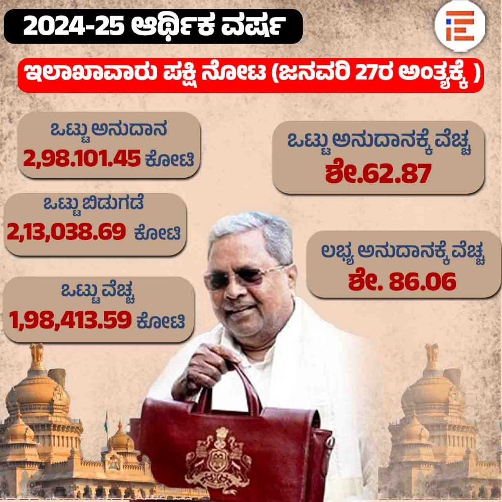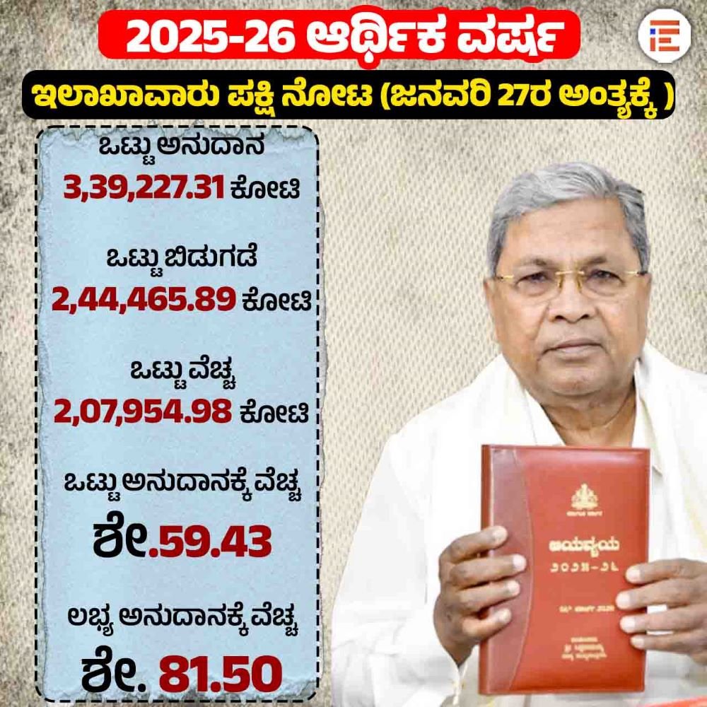 ಆದರೆ 2025-26ನೇ ಸಾಲಿನ ಜನವರಿ 27ರ ಅಂತ್ಯಕ್ಕೆ ಒಟ್ಟು ಅನುದಾನಕ್ಕೆ ಶೇ.59.43 ಮತ್ತು ಲಭ್ಯ ಅನುದಾನಕ್ಕೆ ಶೇ. 81.50ರಷ್ಟು ವೆಚ್ಚವಾಗಿರುವುದು ಅಂಕಿ ಅಂಶಗಳಿಂದ ತಿಳಿದು ಬಂದಿದೆ.