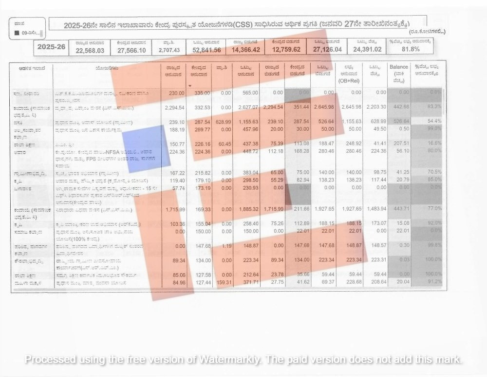 ಕೇಂದ್ರ ಪುರಸ್ಕೃತ ಯೋಜನೆಗಳಡಿಯಲ್ಲಿಯೂ 2024-25ನೇ ಸಾಲಿನಲ್ಲಿ 29,620.12 ಕೋಟಿಯಷ್ಟು ವೆಚ್ಚವಾಗಿದ್ದರೇ 2025-26ನೇ ಸಾಲಿನಲ್ಲಿ 24,391.02 ಕೋಟಿ ಖರ್ಚಾಗಿದೆ. ಕಳೆದ ವರ್ಷಕ್ಕೆ ಹೋಲಿಸಿದರೇ 5,239.1 ಕೋಟಿಯಷ್ಟು ಕಡಿಮೆ ವೆಚ್ಚವಾದಂತಾಗಿದೆ.