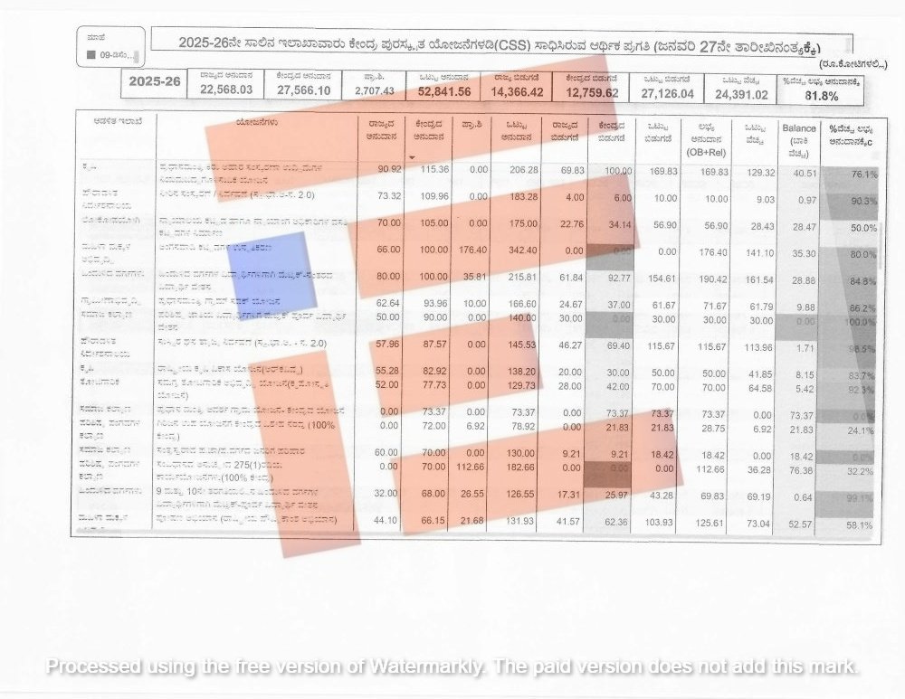 ಕೇಂದ್ರ ಮತ್ತು ರಾಜ್ಯ ಸರ್ಕಾರವು ಕೇಂದ್ರ ಪುರಸ್ಕೃತ ಯೋಜನೆಗಳಡಿಯಲ್ಲಿ 2024-25ನೇ ಸಾಲಿನಲ್ಲಿ 27,884.14 ಕೋಟಿ ರು ಬಿಡುಗಡೆ ಮಾಡಿದ್ದರೇ 2025-26ರಲ್ಲಿ 27,126.04 ಕೋಟಿ ರು ಬಿಡುಗಡೆ ಮಾಡಿದೆ. 2024-25ರಲ್ಲಿ 29,620.12 ಕೋಟಿ ರು ವೆಚ್ಚ ಮಾಡಿದೆ. ಇದು ಅನುದಾನ ಬಿಡುಗಡೆಯಾಗಿದ್ದಕ್ಕಿಂತಲೂ ಅಂದರೇ 1,735.98 ಕೋಟಿ ರು ಹೆಚ್ಚಿಗೆ ವೆಚ್ಚ ಮಾಡಿದೆ. ಅದೇ ರೀತಿ 2025-26ರ ಜನವರಿ 27ರ ಅಂತ್ಯಕ್ಕೆ 24,391.02 ಕೋಟಿ ರು ವೆಚ್ಚ ಮಾಡಿದೆ. ಬಿಡುಗಡೆ ಮಾಡಿದ್ದ ಹಣದಲ್ಲಿಯೇ ಇನ್ನೂ 2,735.02 ಕೋಟಿ ರು ಗಳನ್ನು ವೆಚ್ಚಕ್ಕೆ ಬಾಕಿ ಇರುವುದು ಗೊತ್ತಾಗಿದೆ.