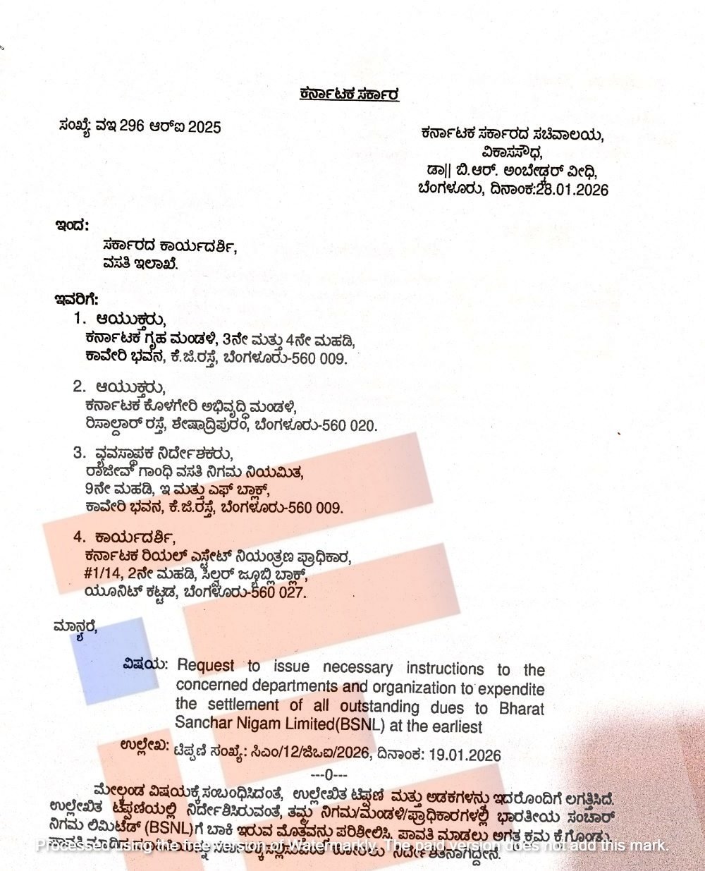 ವಸತಿ ಇಲಾಖೆಯ ಸರ್ಕಾರದ ಕಾರ್ಯದರ್ಶಿಯು ಕರ್ನಾಟಕ ಗೃಹ ಮಂಡಳಿ, ಕರ್ನಾಟಕ ಕೊಳಗೇರಿ ಅಭಿವೃದ್ಧಿ ಮಂಡಳಿ, ರಾಜೀವ್ ಗಾಂಧಿ ವಸತಿ ನಿಗಮ, ಕರ್ನಾಟಕ ರಿಯಲ್ ಎಸ್ಟೇಟ್ ನಿಯಂತ್ರಣ ಪ್ರಾಧಿಕಾರಕ್ಕೆ ಪತ್ರ ಬರೆದಿದ್ದಾರೆ.