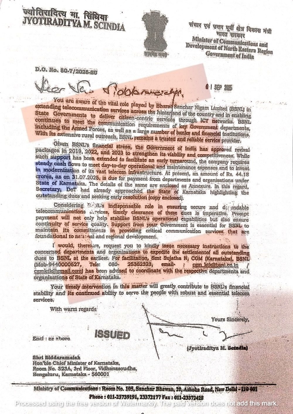 ರಾಜ್ಯ ಸರ್ಕಾರದ ಹಲವು ಇಲಾಖೆಗಳು 2025ರ ಜುಲೈ ಅಂತ್ಯಕ್ಕೆ 44.18 ಕೋಟಿಯಷ್ಟು ಬಾಕಿ ಉಳಿಸಿಕೊಂಡಿದ್ದವು. ಹೀಗಾಗಿ ಈ ಮೊತ್ತವನ್ನು ಪಾವತಿಸಲು ಸರ್ಕಾರದ ಇಲಾಖೆಗಳಿಗೆ ನಿರ್ದೇಶನ ನೀಡಬೇಕು ಎಂದು ಕೇಂದ್ರ ಸಂಪರ್ಕ ಖಾತೆಯ ಸಚಿವ ಜ್ಯೋತಿರಾದಿತ್ಯ ಸಿಂಧ್ಯ ಅವರು ಮುಖ್ಯಮಂತ್ರಿಗೆ ನೇರವಾಗಿ ಬರೆದಿದ್ದ ಪತ್ರದಲ್ಲಿ ಕೋರಿದ್ದರು.