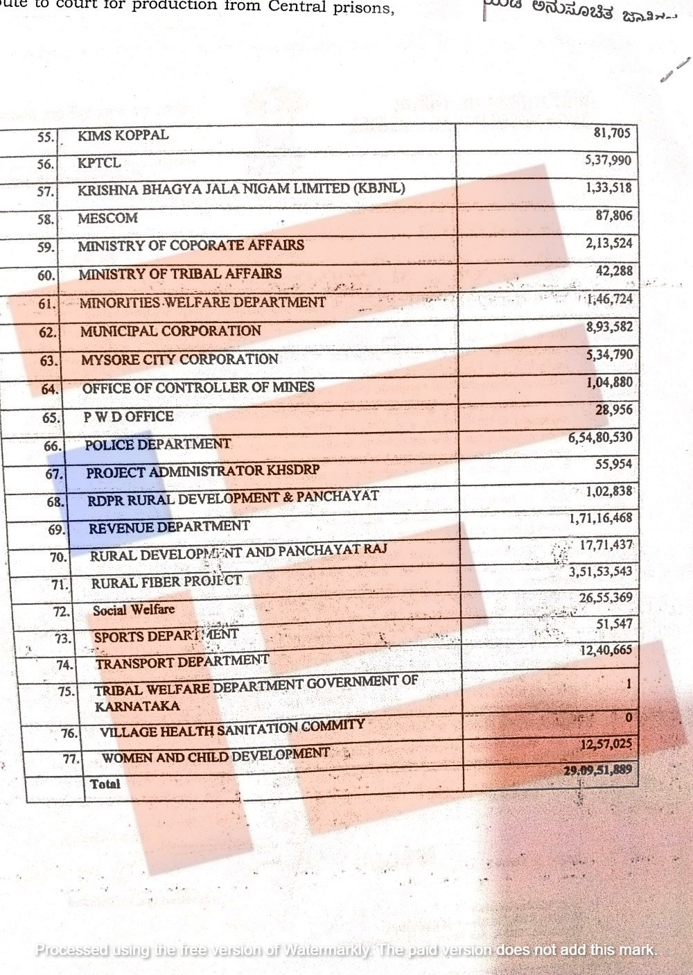 ಬಾಕಿ ಉಳಿಸಿಕೊಂಡಿರುವ ಇಲಾಖೆಗಳ ಪೈಕಿ ಪೊಲೀಸ್ ಇಲಾಖೆಯು 6.54 ಕೋಟಿ, ರೂರಲ್ ಫೈಬರ್ ಪ್ರಾಜೆಕ್ಟ್ ಶಾಖೆಯಿಂದ 3.51 ಕೋಟಿ ಪಾವತಿಸಬೇಕಿದೆ. ಕೊಪ್ಪಳದ ಕಿಮ್ಸ್ನಿಂಧ 81,705, ಕೆಪಿಟಿಸಿಎಲ್ನಿಂದ 5,37,990, ಕೃಷ್ಣ ಭಾಗ್ಯ ಜಲ ನಿಗಮದಿಂದ 1,33,518 , ಮೆಸ್ಕಾಂನಿಂದ 87,806, ಕಾರ್ಪೋರೇಟ್ ವ್ಯವಹಾರಗಳ ಸಚಿವಾಲಯದಿಂದ 2,13,524, ಪರಿಶಿಷ್ಟ ಪಂಗಡಗಳ ಇಲಾಖೆಯು 42,288, ಅಲ್ಪಸಂಖ್ಯಾತರ ಕಲ್ಯಾಣ ಇಲಾಖೆಯು 1,46,724, ಮುನ್ಸಿಪಲ್ ಕಾರ್ಪೋರೇಷನ್ನಿಂದ 8,93,582, ಮೈಸೂರು ಮಹಾನಗರಪಾಲಿಕೆ 5,34,790, ಗಣಿ ನಿಯಂತ್ರಕರ ಕಚೇರಿ 1,04,880, ಪಿಡಬ್ಲ್ಯೂಡಿ ಕಚೇರಿಗಳು 28,956, ಕೆಎಚ್ಎಸ್ಡಿಆರ್ಪಿ 55,954, ಕಂದಾಯ ಇಲಾಖೆ 1.71 ಕೋಟಿ, ಆರ್ಡಿಪಿಆಋf 17,71,437, ಸಮಾಜ ಕಲ್ಯಾಣ ಇಲಾಖೆ 26,55,369, ಕ್ರೀಡಾ ಇಲಾಖೆ 51,547, ಸಾರಿಗೆ ಇಲಾಖೆ 12,40,665, ಮಹಿಳಾ ಮತ್ತು ಮಕ್ಕಳ ಕಲ್ಯಾಣ ಅಭಿವೃದ್ಧಿ ಇಲಾಖೆ 12,57,025 ರು ಸೇರಿ ಒಟ್ಟಾರೆ 29,09,51,889 ರು ಬಾಕಿ ಉಳಿಸಿಕೊಂಡಿರುವುದು ಪತ್ರದಿಂದ ತಿಳಿದು ಬಂದಿದೆ.