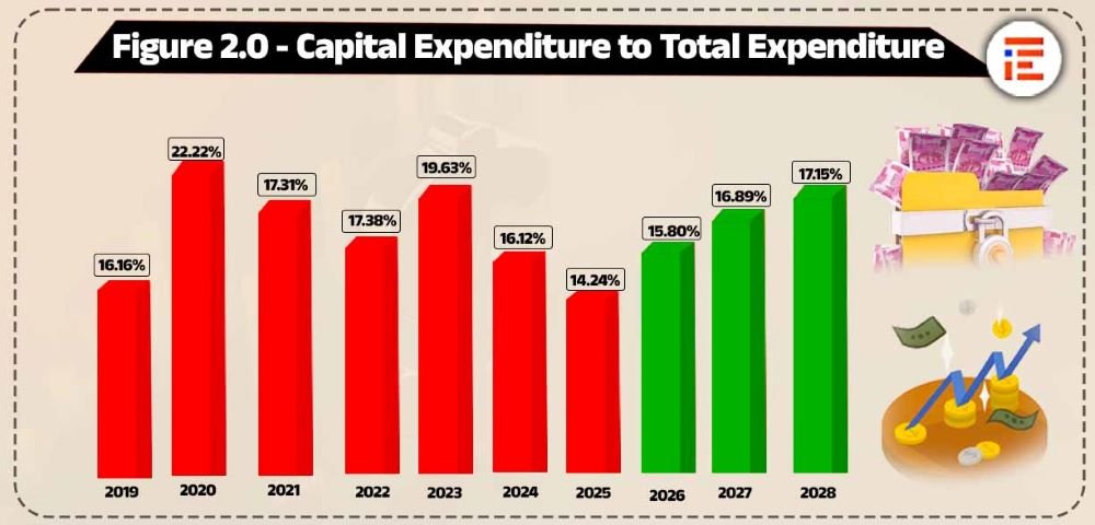 ಅಂದರೆ, ಪ್ರಸ್ತುತ, ಸಾಲ ಮರುಪಾವತಿ ಬಾಬ್ತಿನ ಮೊತ್ತವು ಬಂಡವಾಳ ವೆಚ್ಚವನ್ನು ಹಿಂದಿಕ್ಕಿರುವುದು ಕಳವಳ ಮೂಡಿಸುವ ಅಂಶವಾಗಿದೆ. ಇದು 2028ರ ವೇಳೆಗೆ ಶೇಕಡಾ 84.12ರಷ್ಟಾಗಬಹುದು. ಅಂದರೆ ಆ ವೇಳೆಗೆ, ಸರ್ಕಾರವು ಸಾಲ ಮರುಪಾವತಿ ಬಾಬ್ತಿಗೆಂದು ಮಾಡುವ ಪ್ರತಿ 100 ರೂಪಾಯಿ ವೆಚ್ಚಕ್ಕೆ 84.12 ರೂಪಾಯಿಯನ್ನು ಮಾತ್ರ ಬಂಡವಾಳ ವೆಚ್ಚಕ್ಕಾಗಿ ಮೀಸಲಿಡುವ ಸಾಮರ್ಥ್ಯ ಹೊಂದಿರುತ್ತದೆ.