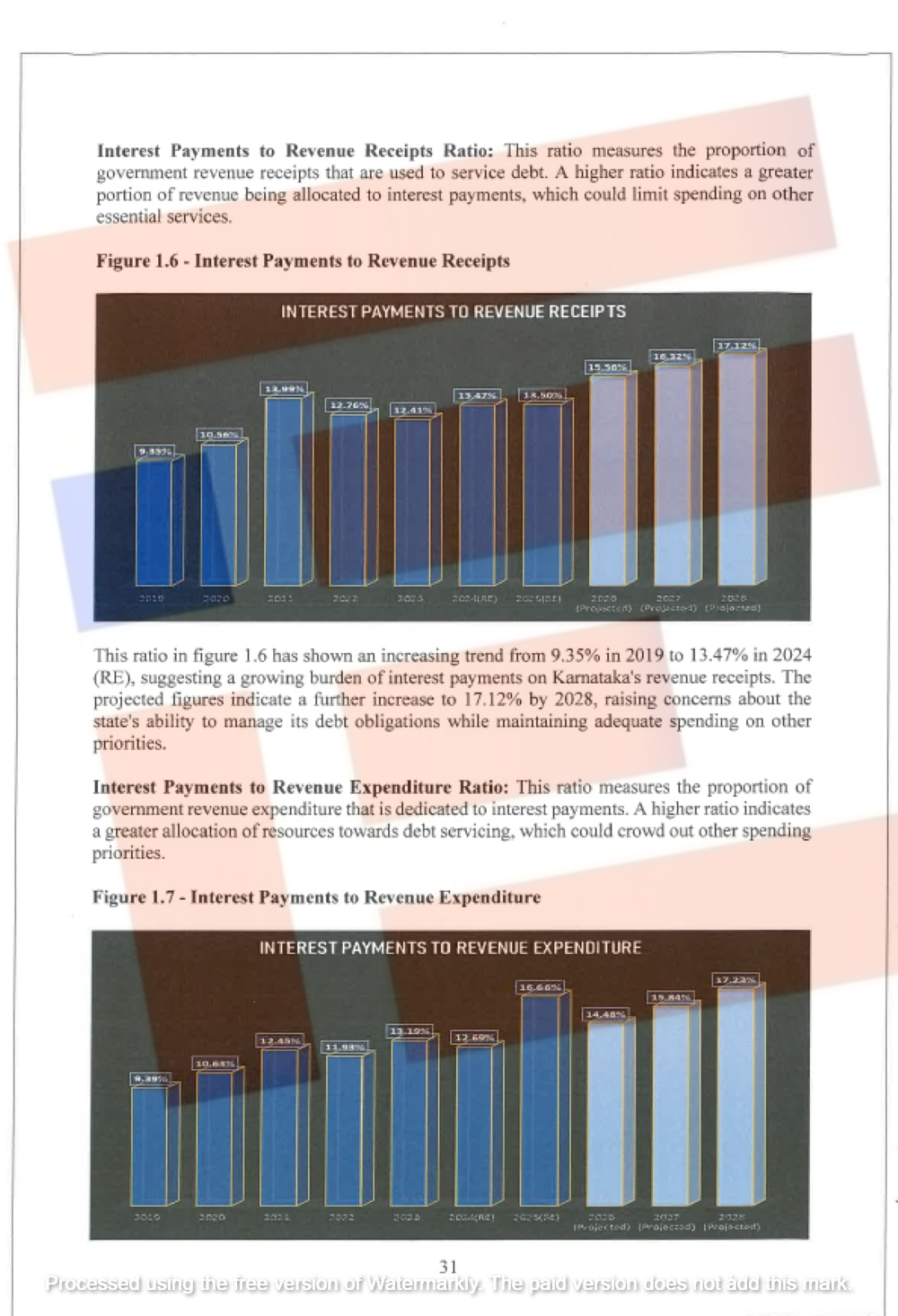 ಹಾಗೆಯೇ, ಸರ್ಕಾರದ ಬಡ್ಡಿ ಪಾವತಿ ಹಾಗೂ ರಾಜಸ್ವ ವೆಚ್ಚದ ನಡುವಿನ ಅನುಪಾತದಲ್ಲೂ ಹೆಚ್ಚಳ ಕಂಡುಬರುತ್ತಿದೆ. ಒಟ್ಟಾರೆ ರಾಜಸ್ವ ವೆಚ್ಚದಲ್ಲಿ ಬಡ್ಡಿ ಪಾವತಿ ಬಾಬ್ತು 2019ರಲ್ಲಿ ಶೇಕಡಾ 9.39ರಷ್ಟು ಇದ್ದುದು 2024ರಲ್ಲಿ ಶೇಕಡಾ 12.69ಕ್ಕೆ ಹೆಚ್ಚಳವಾಗಿದೆ. ಲೆಕ್ಕಾಚಾರದ ಪ್ರಕಾರ, ಈ ಪ್ರಮಾಣವು 2028ರ ವೇಳೆಗೆ ಶೇಕಡಾ 17.23ರಷ್ಟಾಗಬಹುದು. ಈ ಹೊರೆಯು ರಾಜ್ಯದ ಹಣಕಾಸು ಸ್ಥಿತಿಗತಿಯ ಮೇಲೆ ಒತ್ತಡ ಉಂಟಾಗಲು ಕಾರಣವಾಗಬಹುದೆಂದು ಅಧ್ಯಯನಕಾರರು ಎಚ್ಚರಿಸಿದ್ದಾರೆ.