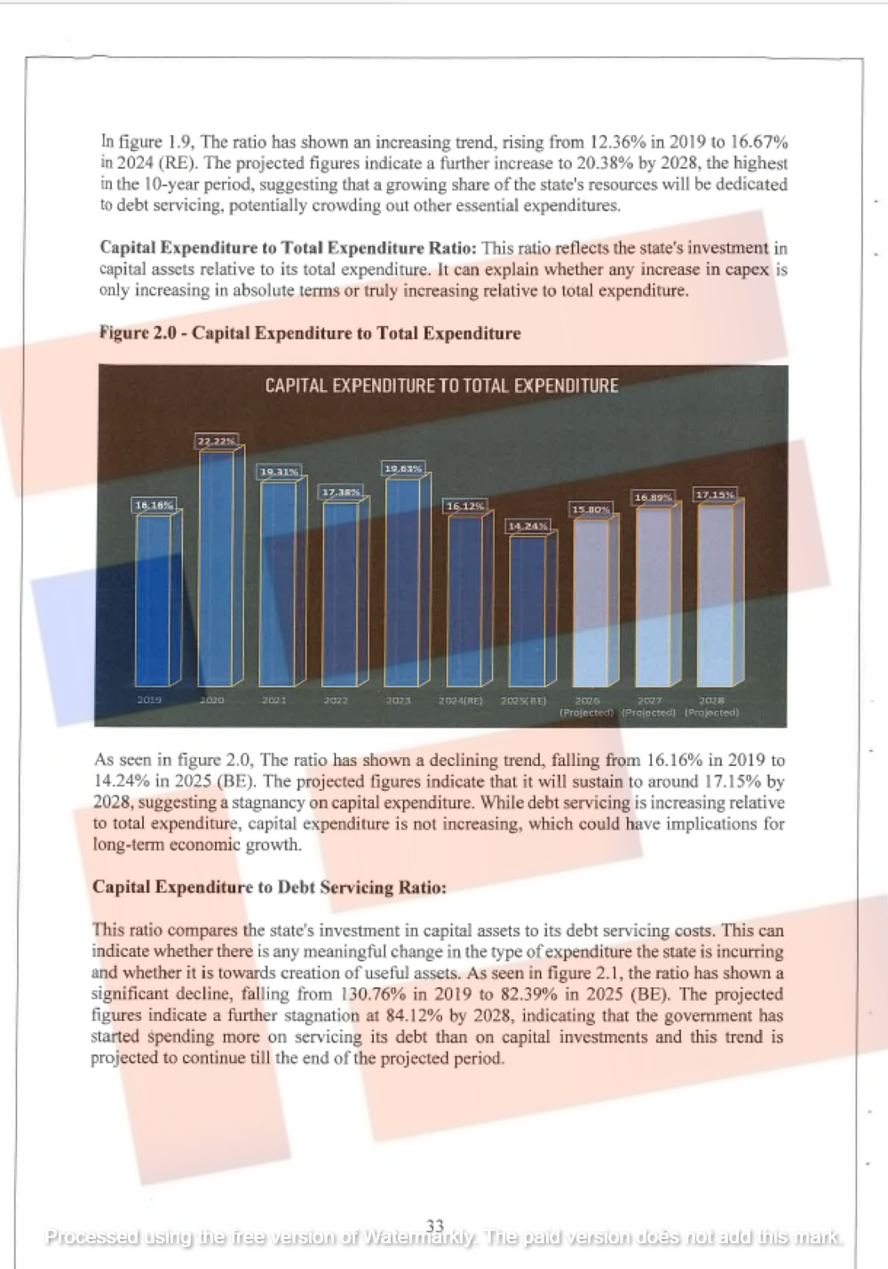 ಸಾಲ ಮರುಪಾವತಿ ಬಾಬ್ತಿನ ಹೊರೆಯು 2028ರ ವೇಳೆಗೆ ರಾಜಸ್ವ ಸಂಗ್ರಹದ ಶೇಕಡಾ 26.84ರಷ್ಟಾಗಲಿದ್ದು, ಇದು 2019ರ ಶೇಕಡಾ 14.69ಕ್ಕೆ ಹೋಲಿಸಿದರೆ ಗಣನೀಯ ಪ್ರಮಾಣದ ಹೆಚ್ಚಳವಾಗಲಿದೆ. ಇಳಿಕೆ ಹಾದಿಯಲ್ಲಿರುವ ಬಂಡವಾಳ ವೆಚ್ಚವು 2028ರ ವೇಳೆಗೆ ಒಟ್ಟಾರೆ ವೆಚ್ಚಕ್ಕೆ ಹೋಲಿಸಿದರೆ ಶೇಕಡಾ 17.15.ರಷ್ಟಾಗಲಿದೆ. ಹಾಗೆಯೇ, ಒಟ್ಟಾರೆ ವೆಚ್ಚಕ್ಕೆ ಹೋಲಿಸಿದರೆ ಸಾಲ ಮರುಪಾವತಿ ಬಾಬ್ತು 2019ರಲ್ಲಿ ಶೇಕಡಾ12.36ರಷ್ಟು ಇದ್ದುದು 2028ರ ವೇಳೆಗೆ ಶೇಕಡಾ 20.38ರಷ್ಟಾಗಲಿದೆ.