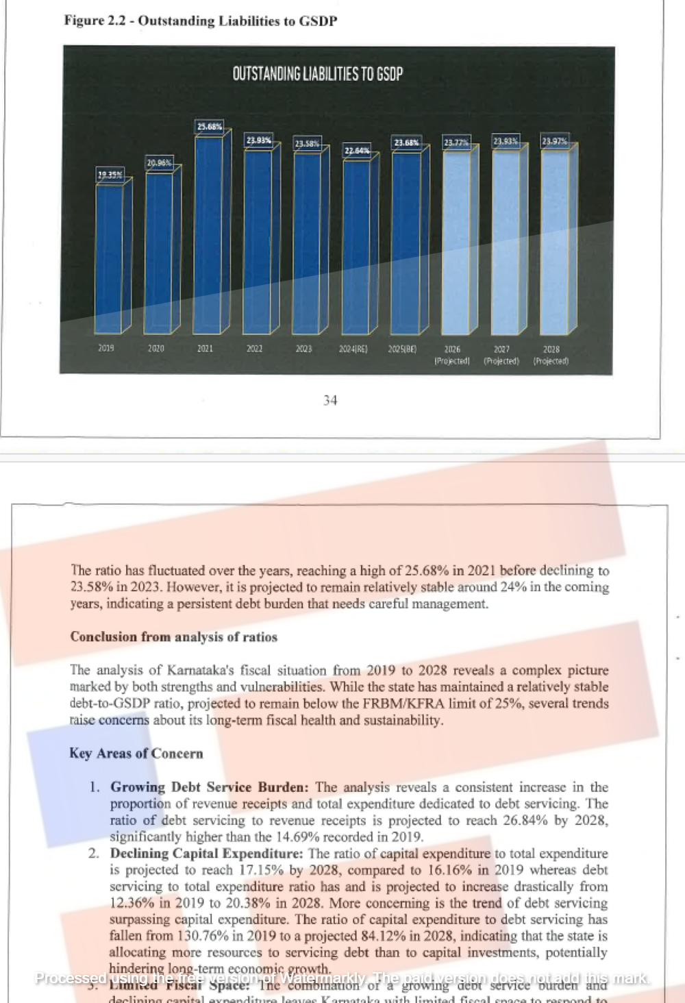 ರಾಜ್ಯದ ಸಾಲ ಬಾಧ್ಯತೆ ಹಾಗೂ ಜಿ.ಎಸ್.ಡಿ.ಪಿ. (ರಾಜ್ಯದ ಒಟ್ಟಾರೆ ಆಂತರಿಕ ಉತ್ಪಾದನೆ) ಅನುಪಾತವು 2021ರಲ್ಲಿ ಶೇಕಡಾ 25.68ರಷ್ಟು ಇದು. ನಂತರ, ಇಳಿಕೆ ಕಂಡ ಈ ಪ್ರಮಾಣವು 2023ರಲ್ಲಿ ಶೇಕಡಾ 23.58ರಷ್ಟಾಯಿತು. ಅಂದಾಜಿನ ಪ್ರಕಾರ 2028ರ ವೇಳೆಗೆ ಇದು ಶೇಕಡಾ 24ರಷ್ಟು ಇರಲಿದೆ ಎಂದು ಅಂದಾಜಿಸಲಾಗಿದೆ. ರಾಜ್ಯದ ಸಾಲದ ಹೊರೆಯು ಬರುವ ವರ್ಷಗಳಲ್ಲೂ ಮುಂದುವರಿಯಲಿದೆ ಎಂಬುದನ್ನು ಹಾಗೂ ಜಾಗರೂಕ ವಿತ್ತೀಯ ನಿರ್ವಹಣೆಯ ಅಗತ್ಯವನ್ನು ಇದು ಸೂಚಿಸುತ್ತದೆ ಎಂದು ವರದಿಯಲ್ಲಿ ಗಮನಸೆಳೆಯಲಾಗಿದೆ.
