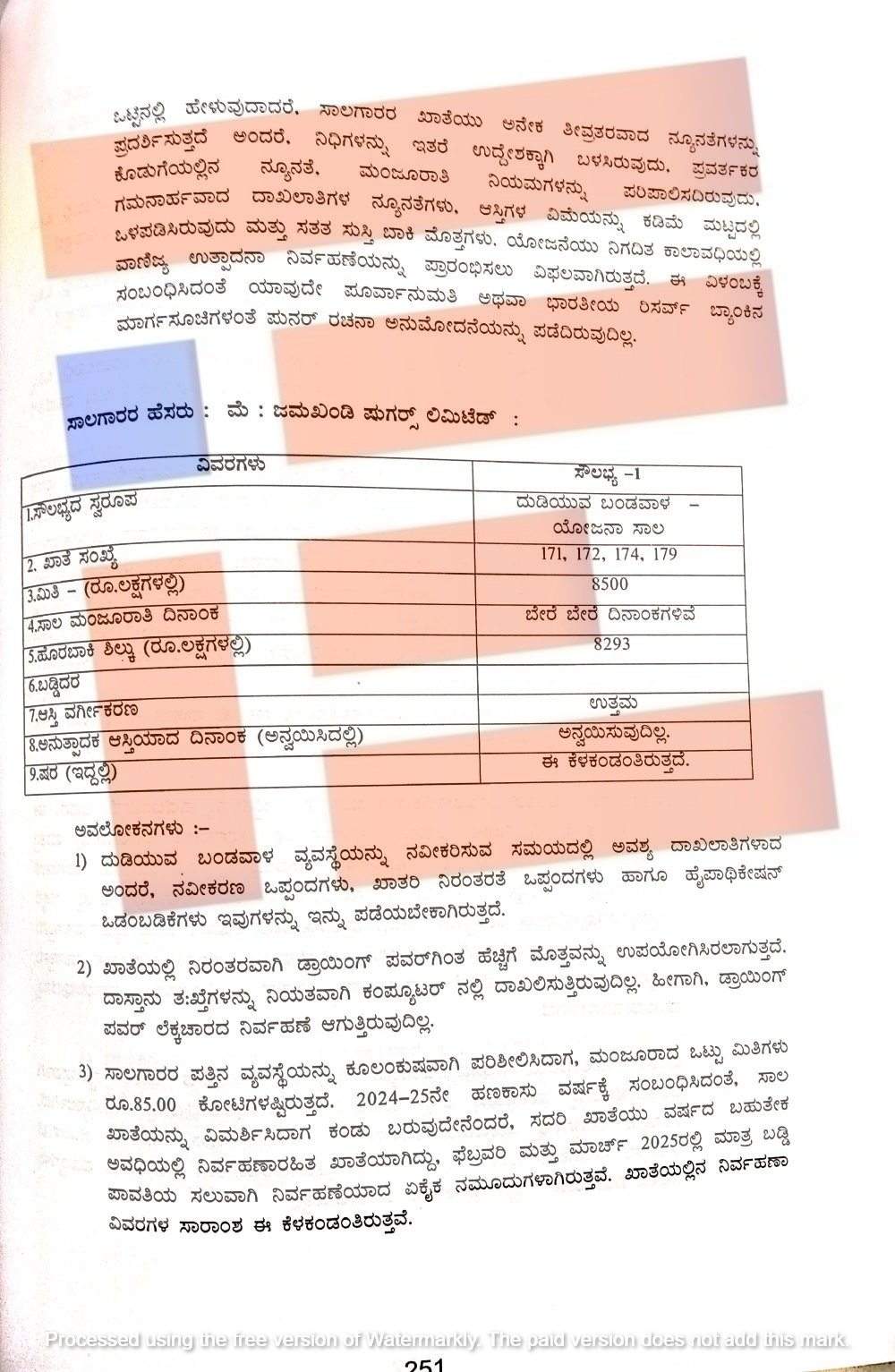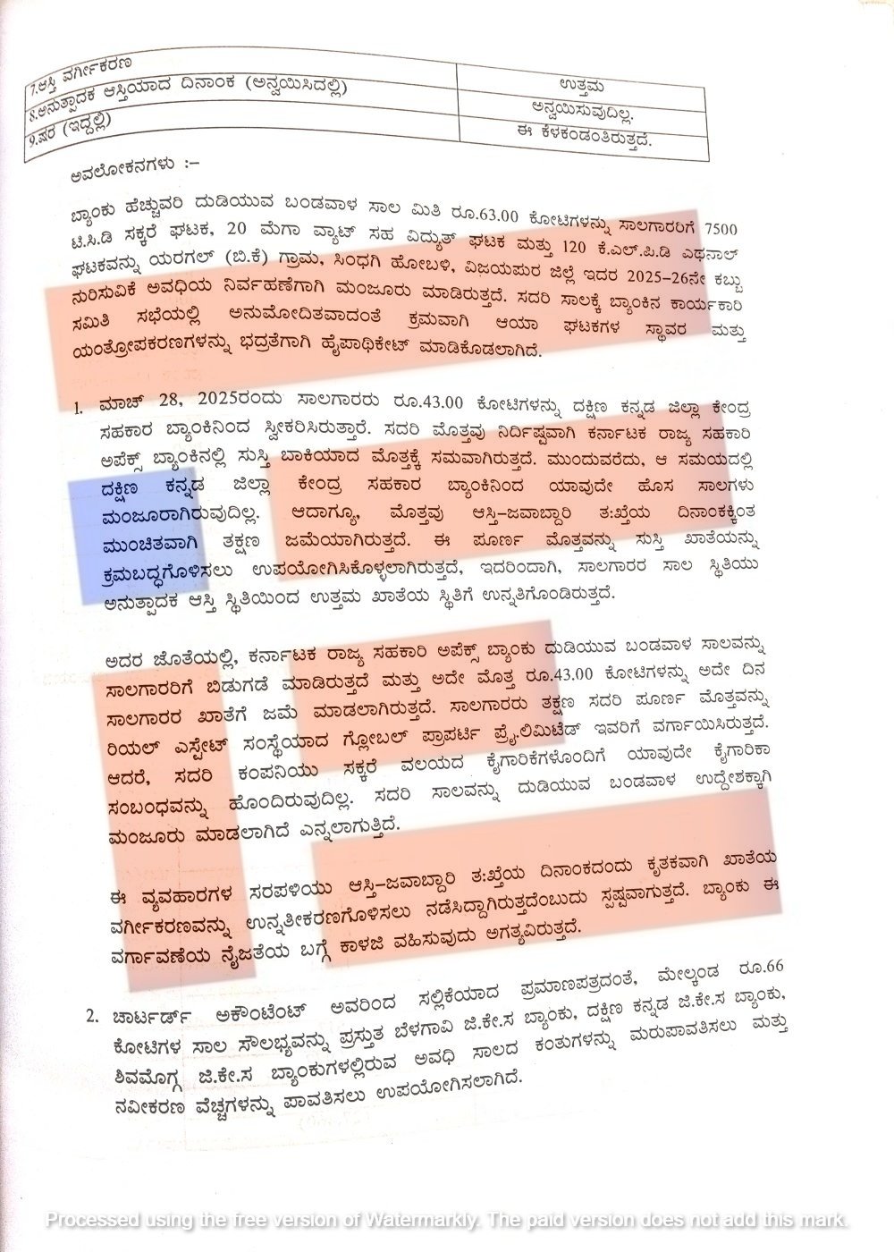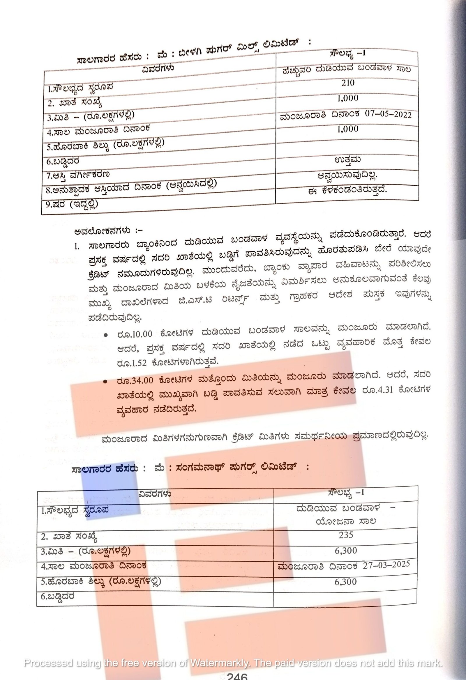 ಚಾರ್ಟರ್ಡ್ ಅಕೌಂಟೆಂಟ್ ರಿಂದ ಸಲ್ಲಿಕೆಯಾಗಿದ್ದ ಪ್ರಮಾಣ ಪತ್ರದ ಪ್ರಕಾರ 66 ಕೋಟಿ ರು.ಗಳ ಸಾಲ ಸೌಲಭ್ಯವನ್ನು ಬೆಳಗಾವಿ ಜಿಲ್ಲಾ ಕೇಂದ್ರ ಸಹಕಾರಿ ಬ್ಯಾಂಕ್, ದಕ್ಷಿಣ ಕನ್ನಡ ಮತ್ತು ಶಿವಮೊಗ್ಗ ಜಿಲ್ಲಾ ಕೇಂದ್ರ ಸಹಕಾರಿ ಬ್ಯಾಂಕ್ಗಳಲ್ಲಿರುವ ಅವಧಿ ಸಾಲದ ಕಂತುಗಳನ್ನು ಮರು ಪಾವತಿಸಲು ಮತ್ತು ನವೀಕರಣ ವೆಚ್ಚಗಳನ್ನು ಪಾವತಿಸಲು ಉಪಯೋಗಿಸಿತ್ತು. ‘ಆದುದರಿಂದ ಬ್ಯಾಂಕ್, ತಾನು ವಿತರಣೆ ಮಾಡಿದ ಸಾಲ ಯಾವ ಉದ್ದೇಶಕ್ಕಾಗಿ ಮಾಡಲಾಗಿದೆಯೋ ಅದೇ ಉದ್ದೇಶಕ್ಕೆ ಬಳಕೆಯಾಗಿದೆ ಎಂಬ ಬಗ್ಗೆ ಖಾತರಿಪಡಿಸಿಕೊಳ್ಳುವುದು ಸೂಕ್ತವಾಗಿದೆ,’ ಎಂದು ಲೆಕ್ಕ ಪರಿಶೋಧನ ವರದಿಯಲ್ಲಿ ಸಲಹೆ ನೀಡಲಾಗಿದೆ.