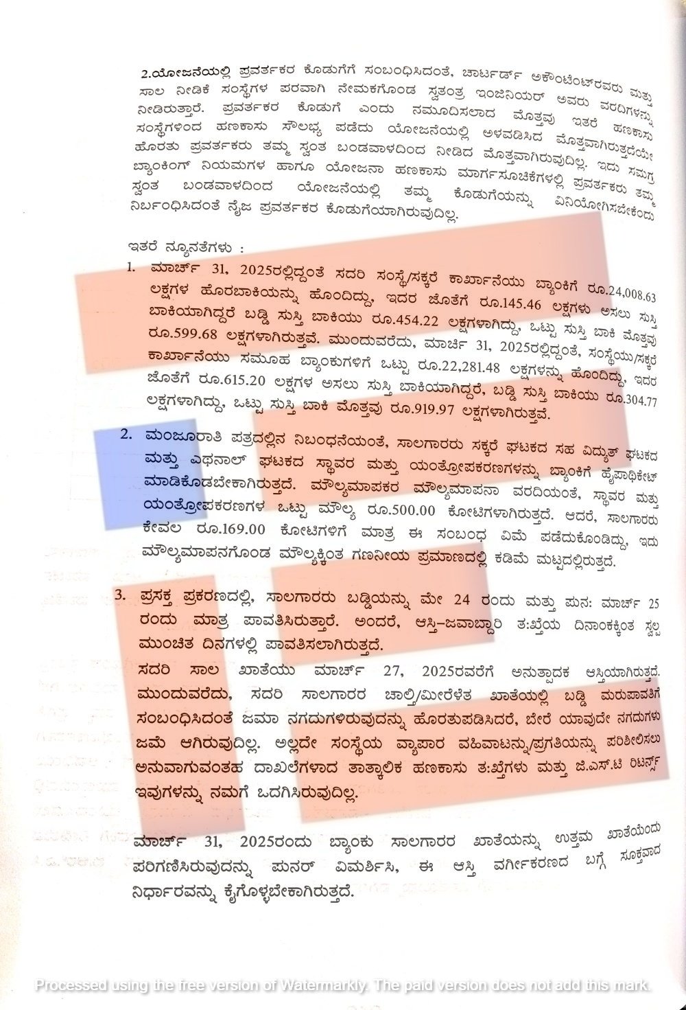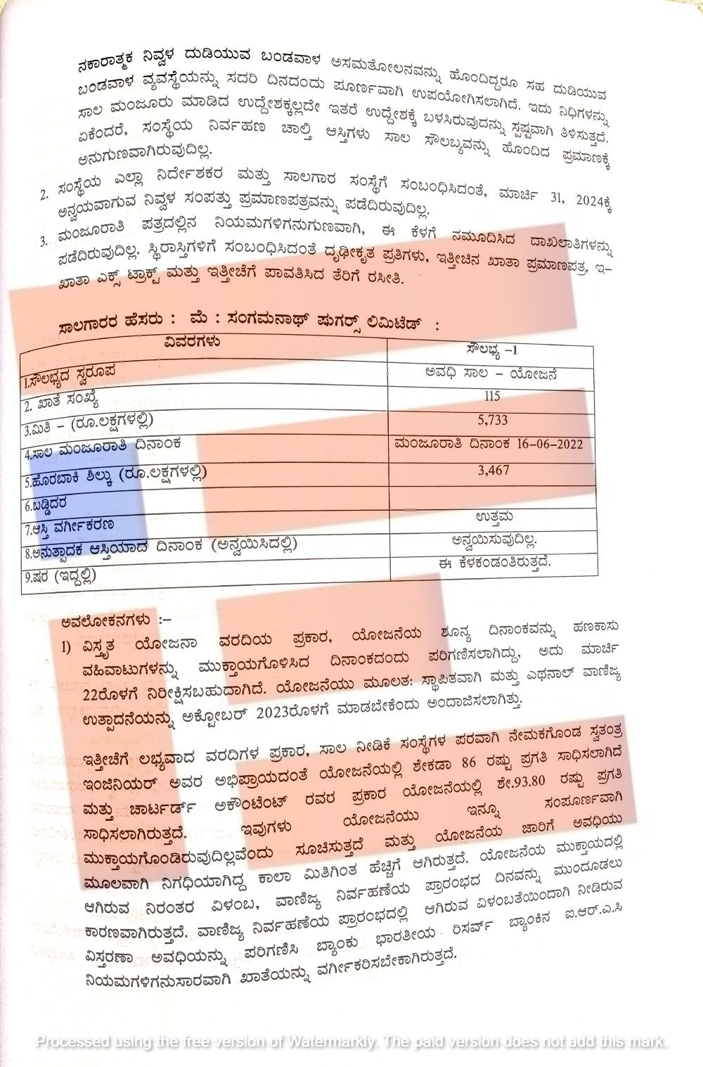 ಸಾಲ ಖಾತೆ 115ಕ್ಕೆ ಅಪೆಕ್ಸ್ ಬ್ಯಾಂಕ್ 2022ರ ಜೂನ್ 16ರಂದು 57.33 ಕೋಟಿ ರು ಗಳನ್ನು ಅವಧಿ ಸಾಲದ ರೂಪದಲ್ಲಿ ಮಂಜೂರು ಮಾಡಿತ್ತು.