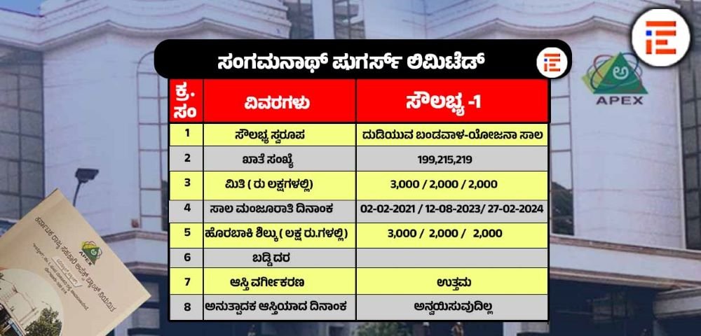 2025ರ ಮಾರ್ಚ್ 27ರಂದು ಅಪೆಕ್ಸ್ ಬ್ಯಾಂಕ್, ಈ ಕಂಪನಿಗೆ 63 ಕೋಟಿ ರು ಸಾಲವನ್ನು ದುಡಿಯುವ ಬಂಡವಾಳ ಯೋಜನಾ ಸಾಲವನ್ನಾಗಿ ಮಂಜೂರು ಮಾಡಿದೆ.