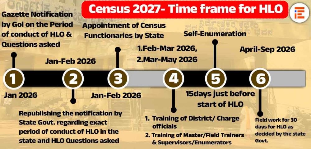 ಜನಗಣತಿ ಕಾರ್ಯವು ಎರಡು ಹಂತಗಳಲ್ಲಿ ನಡೆಯಲಿದೆ. ಮನೆಪಟ್ಟಿ ಮತ್ತು ಮನೆಗಳ ಗಣತಿ ಕಾರ್ಯ 2026ರ ಏಪ್ರಿಲ್ 1ರಿಂದ ಸೆಪ್ಟೆಂಬರ್ 30ರವರೆಗೆ ನಡೆಯಲಿದ್ದು, ಜನಗಣತಿ ಹಂತವು 2027ರ ಫೆಬ್ರುವರಿ 9ರಿಂದ 28ರವರೆಗೆ ನಡೆಯಲಿದೆ. 2027ರ ಮಾರ್ಚ್ 1ನ್ನು ಉಲ್ಲೇಖ ದಿನಾಂಕವಾಗಿ ಪರಿಗಣಿಸಲಾಗುತ್ತದೆ.2027ರ ಜನಗಣತಿಗೆ ಪೂರ್ವಸಿದ್ಧತೆಯ ಹಿನ್ನೆಲೆಯಲ್ಲಿ, ಗಣತಿದಾರರು ಮತ್ತು ಮೇಲ್ವಿಚಾರಕರ ನೇಮಕಾತಿಯನ್ನು ಜನವರಿ 15, 2026ರೊಳಗೆ ಪೂರ್ಣಗೊಳಿಸಬೇಕೆಂದು ಎಲ್ಲಾ ರಾಜ್ಯಗಳು ಮತ್ತು ಕೇಂದ್ರಾಡಳಿತ ಪ್ರದೇಶಗಳಿಗೆ, ರಿಜಿಸ್ಟ್ರಾರ್‌ ಜನರಲ್‌ (RGI) ನೂತನ ಸುತ್ತೋಲೆಯ ಮೂಲಕ ಕಟ್ಟುನಿಟ್ಟಾಗಿ ನಿರ್ದೇಶಿಸಿದೆ.