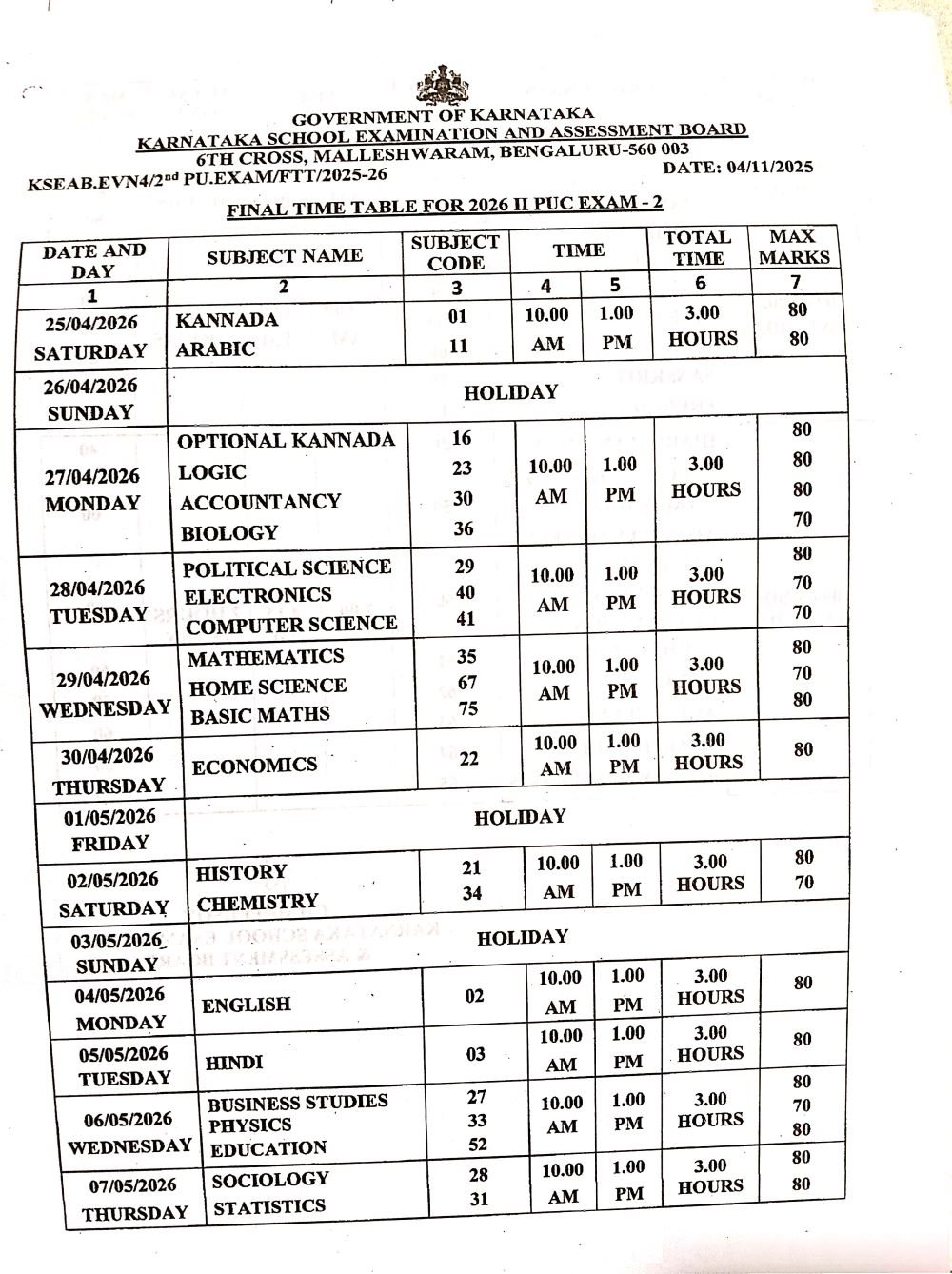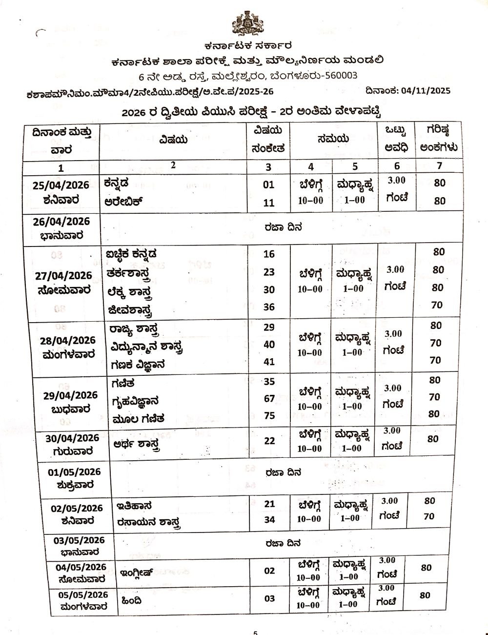 ದ್ವಿತೀಯ ಪಿಯುಸಿ ಪರೀಕ್ಷೆಯು 2026ರ ಏಪ್ರಿಲ್‌ 25ರಿಂದ 2026ರ ಮೇ 9ರವರೆಗೆ ನಡೆಯಲಿದೆ. ಈಗಾಗಲೇ ಅಂತಿಮ ವೇಳಾಪಟಿಯನ್ನೂ ಪ್ರಕಟಿಸಿದೆ. ಈ ಪರೀಕ್ಷೆ ನಂತರ ಮೌಲ್ಯಮಾಪನ ಕಾರ್ಯಗಳು ಮತ್ತು ಫಲಿತಾಂಶ ಪ್ರಕಟಿಸುವ ಪೂರ್ವ ಸಿದ್ಧತೆಗಳೂ ಸಹ 2026ರ ಮೇ 11ರಿಂದ 2026ರ ಮೇ 25ರವರೆಗೆ ನಡೆಸಲು ಇಲಾಖೆಯು ಉದ್ದೇಶಿಸಿದೆ.