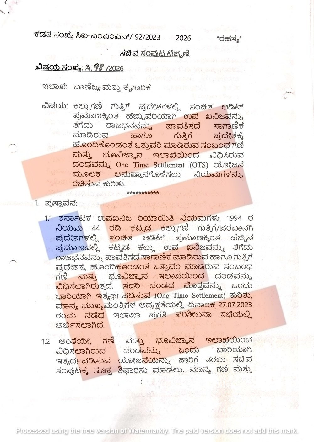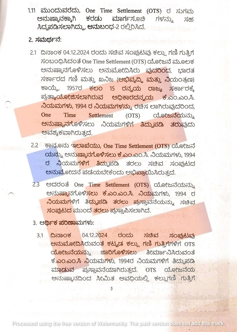 ಒಟಿಎಸ್‌ ಯೋಜನೆ ಅನುಷ್ಠಾನದ ಕುರಿತು ತಿದ್ದುಪಡಿ ಮಾಡಲು ಸಿದ್ಧಪಡಿಸಿರುವ ಕರಡು ನಿಯಮಾವಳಿಗಳು ಕಲ್ಲು ಗಣಿ ಗುತ್ತಿಗೆ ಪ್ರದೇಶಗಳಲ್ಲಿ ಸಂಚಿತ ಆಡಿಟ್ ಪ್ರಮಾಣಕ್ಕಿಂತ ಹೆಚ್ಚುವರಿಯಾಗಿ ಉಪ ಖನಿಜವನ್ನು ತೆಗೆದು ರಾಜಧನವನ್ನು ಪಾವತಿಸದೇ ಸಾಗಾಣಿಕೆ ಮಾಡಿರುವ ಮತ್ತು ಗುತ್ತಿಗೆ ಪ್ರದೇಶಕ್ಕೆ ಹೊಂದಿಕೊಂಡಂತೆ ಒತ್ತುವರಿ ಮಾಡಿರುವ ಸಂಬಂಧ ಗಣಿ ಭೂ ವಿಜ್ಞಾನ ಇಲಾಖೆಯಿಂದ ವಿಧಿಸಿರುವ ದಂಡವನ್ನು ಒಟಿಎಸ್ ಯೋಜನೆ ಮೂಲಕ ಪಾವತಿಸಲು ಅವಕಾಶ ಕಲ್ಪಿಸಲು ಕಾನೂನು ಇಲಾಖೆಯು ಸಹಮತಿಸಿರುವುದು ಟಿಪ್ಪಣಿ ಹಾಳೆಯಿಂದ ಗೊತ್ತಾಗಿದೆ.