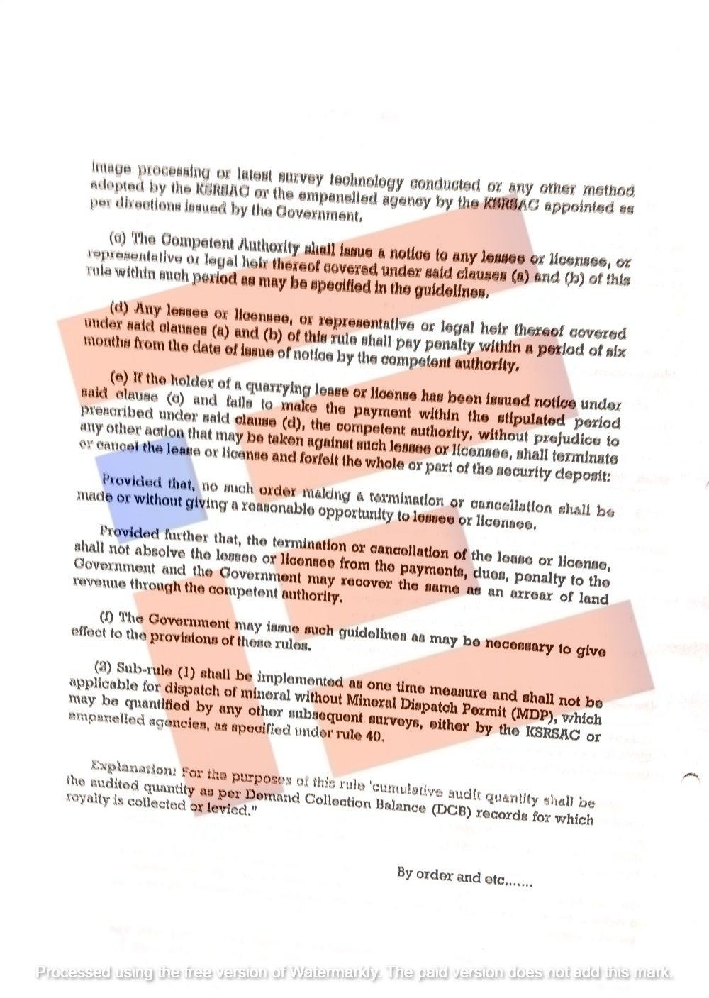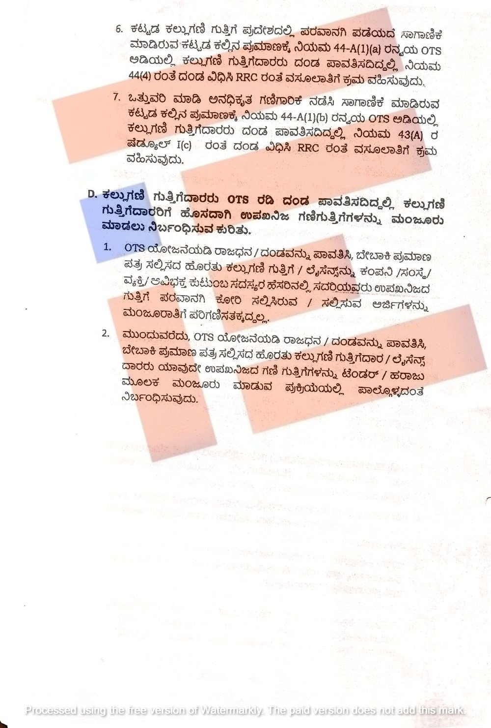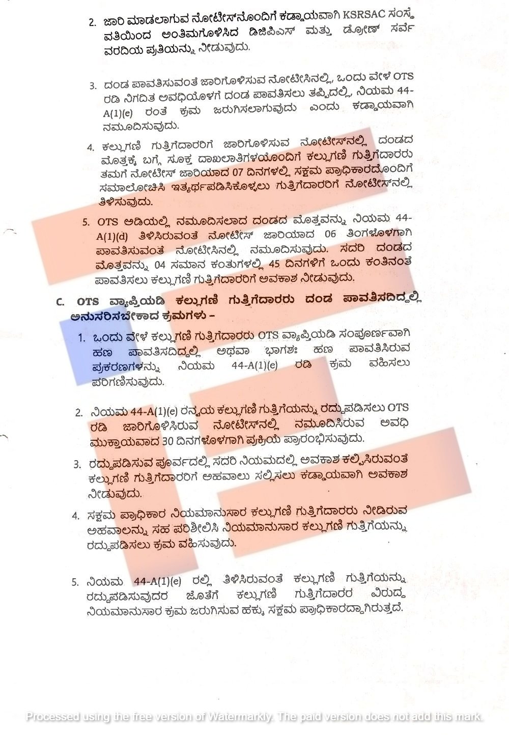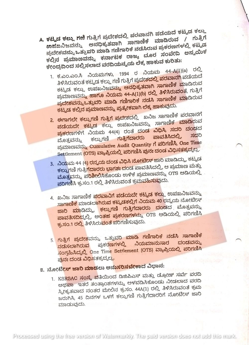 ನಿಯಮ 44(4) ಅನ್ವಯ ದಂಡ ವಿಧಿಸಿ ನೋಟೀಸ್‌ ಜಾರಿ ಮಾಡಿದ್ದು ಕಟ್ಟಡ ಕಲ್ಲುಗಣಿ ಗುತ್ತಿಗೆದಾರರು ಭಾಗಶಃ ದಂಡ ಪಾವತಿಸಿದಲ್ಲಿ ಆ ಪ್ರಮಾಣ ಮತ್ತು ಮೊತ್ತವನ್ನು ಪರಿಶೀಲಿಸಿಕೊಂಡು ಉಳಿಕೆ ಪ್ರಮಾಣವನ್ನು ಒಟಿಎಸ್ ಅಡಿಯಲ್ಲಿ ಪರಿಗಣಿಸಿ ಕ್ರಮ ವಹಿಸಬೇಕು ಎಂದು ಸೂಚಿಸಿದೆ.
