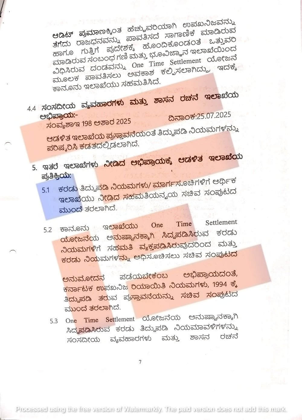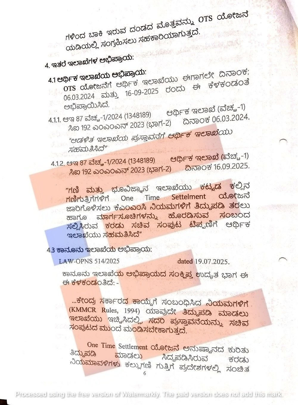 ಒಂದಾವರ್ತಿ ತೀರುವಳಿ (ಒಟಿಎಸ್‌) ಮೂಲಕ ಅನುಷ್ಠಾನಗೊಳಿಸಲು ನಿಯಮ ರಚಿಸಲು ಕೈಗಾರಿಕೆ ಮತ್ತು ವಾಣಿಜ್ಯ ಇಲಾಖೆ ಸಲ್ಲಿಸಿದ್ದ ಪ್ರಸ್ತಾವವನ್ನು ಕಾನೂನು ಇಲಾಖೆಯು ಪರಿಶೀಲಿಸಿತ್ತು. ಕೇಂದ್ರ ಸರ್ಕಾರದ ಕಾಯ್ದೆಗೆ ಸಂಬಂಧಿಸಿದ ನಿಯಮಗಳಿಗೆ (ಕೆಎಂಎಂಸಿಆರ್ ನಿಯಮ 1994) ಯಾವುದೇ ತಿದ್ದುಪಡಿ ಮಾಡಲು ಇಲಾಖೆಯು ಇಚ್ಛಿಸಿದಲ್ಲಿ ಈ ಪ್ರಸ್ತಾವನೆಯನ್ನು ಸಚಿವ ಸಂಪುಟದ ಮುಂದೆ ಮಂಡಿಸಬೇಕಾಗುತ್ತದೆ.