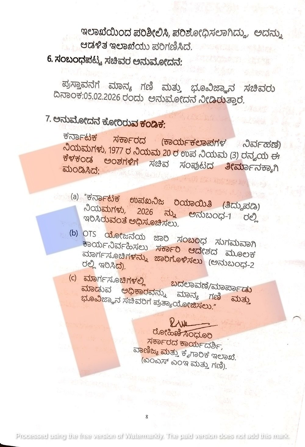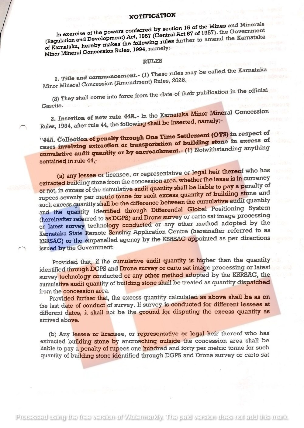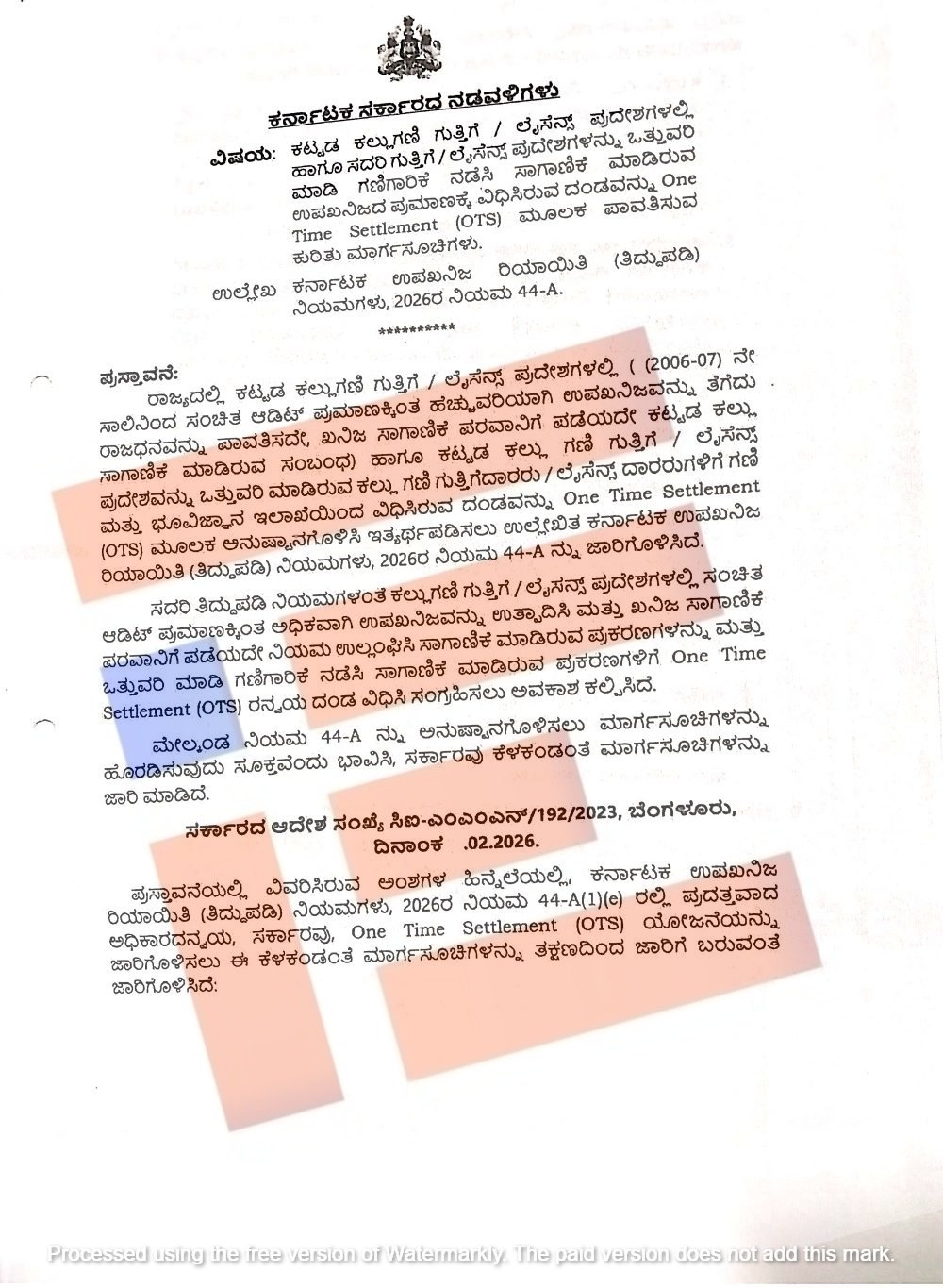 ಗಣಿ ಮತ್ತು ಭೂ ವಿಜ್ಞಾನ ಇಲಾಖೆಯಿಂಧ ವಿಧಿಸಿರುವ ದಂಡವನ್ನು ಒಟಿಎಸ್‌ ಮೂಲಕ ಅನುಷ್ಠಾನಗೊಳಿಸಿ ಮತ್ತು ಇತ್ಯರ್ಥಪಡಿಸಲು ಕರ್ನಾಟಕ ಉಪ ಖನಿಜ ರಿಯಾಯಿತಿ (ತಿದ್ದುಪಡಿ) ನಿಯಮಗಳು 2026 ನಿಯಮ 44-ಎ ಜಾರಿಗೊಳಿಸಲಿದೆ. ಈ ನಿಯಮಗಳ ಮಾರ್ಗಸೂಚಿಗಳನ್ನೂ ಸಹ ಶೀಘ್ರದಲ್ಲಿಯೇ ಹೊರಡಿಸಲಿದೆ.