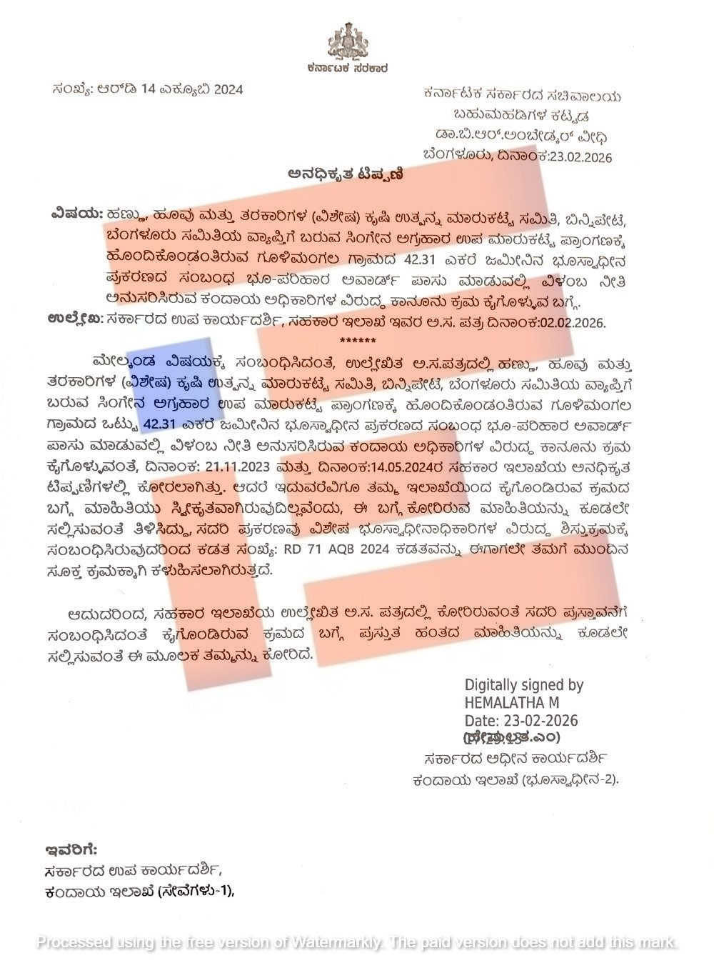 ಸಿಂಗೇನ ಅಗ್ರಹಾರ ಉಪ ಮಾರುಕಟ್ಟೆ ಪ್ರಾಂಗಣಕ್ಕೆ ಹೊಂದಿಕೊಂಡಂತಿರುವ ಗೂಳಿಮಂಗಲ ಗ್ರಾಮದ 42.31 ಎಕರೆ ಜಮೀನಿನ ಭೂ ಸ್ವಾಧೀನ ಪ್ರಕರಣ ಸಂಬಂಧ ಭೂ-ಪರಿಹಾರ ಅವಾರ್ಡ್‌ ಪಾಸ್‌ ಮಾಡುವಲ್ಲಿ ವಿಳಂಬ ನೀತಿ ಅನುಸರಿಸಲಾಗಿದೆ. ಇದಕ್ಕೆ ಕಾರಣರಾದ ಕಂದಾಯ ಅಧಿಕಾರಿಗಳ ವಿರುದ್ಧ ಕಾನೂನು ಕ್ರಮ ಕೈಗೊಳ್ಳಬೇಕು ಎಂದು 2023ರ ನವೆಂಬರ್‍‌ 21 ಮತ್ತು 2024ರ ಮೇ 14ರಂದು ಸಹಕಾರ ಇಲಾಖೆಯು ಕಂದಾಯ ಇಲಾಖೆಯನ್ನು ಕೋರಿತ್ತು. ಆದರೆ ಇದುವರೆಗೂ ಇಲಾಖೆಯಿಂದ ಕೈಗೊಂಡಿರುವ ಕ್ರಮದ ಬಗ್ಗೆ ಮಾಹಿತಿಯು ಸ್ವೀಕೃತವಾಗಿಲ್ಲ. ಅಲ್ಲದೇ ಈ ಪ್ರಕರಣವು ವಿಶೇಷ ಭೂಸ್ವಾಧೀನಾಧಿಕಾರಿಗಳ ವಿರುದ್ಧದ ಶಿಸ್ತುಕ್ರಮಕ್ಕೆ ಸಂಬಂಧಿಸಿದೆ ಎಂದು ಪತ್ರದಲ್ಲಿ ವಿವರಿಸಿರುವುದು ತಿಳಿದು ಬಂದಿದೆ.