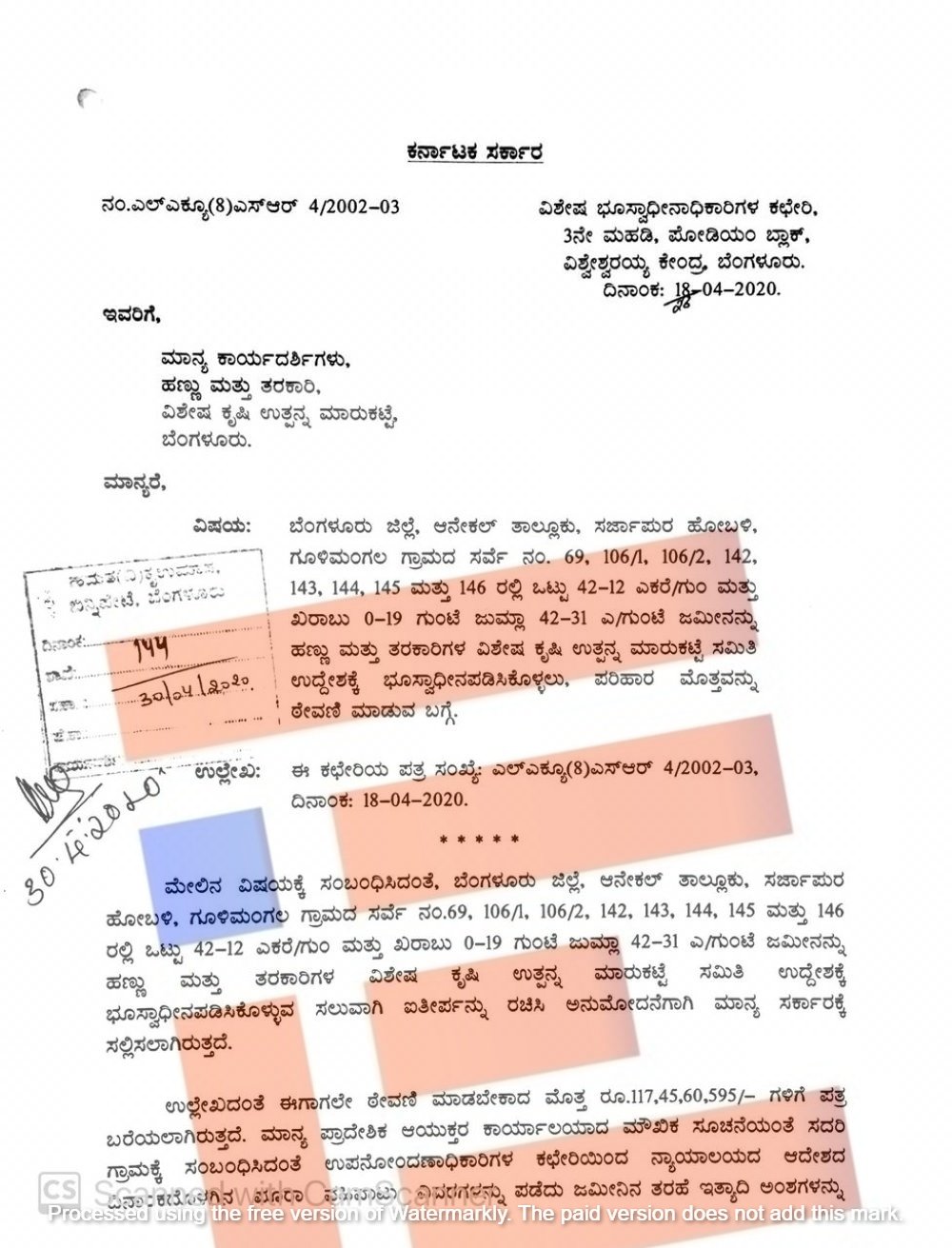 ಆನೇಕಲ್‌ ತಾಲೂಕಿನ ಸರ್ಜಾಪುರ ಹೋಬಳಿಯ ಗೂಳಿಮಂಗಲದಲ್ಲಿ ಉದ್ದೇಶಿತ ಹಣ್ಣು ತರಕಾರಿಗಳ ವಿಶೇಷ ಕೃಷಿ ಉತ್ಪನ್ನ ಮಾರುಕಟ್ಟೆ ಉದ್ದೇಶಕ್ಕೆ ಸ್ವಾಧೀನಪಡಿಸಿಕೊಂಡಿರುವ ಭೂಮಿಗೆ ಪರಿಹಾರ ಮೊತ್ತದ ಪೈಕಿ 123.23 ಕೋಟಿ ರು.ಗಳನ್ನು ವಿಶೇಷ ಭೂ ಸ್ವಾಧೀನಾಧಿಕಾರಿಗಳ ಕಚೇರಿಗೆ ಠೇವಣಿ ಮಾಡಲು ವಿಶೇಷ ಭೂ ಸ್ವಾಧೀನಾಧಿಕಾರಿಗಳು 2020ರ ಏಪ್ರಿಲ್‌ 26ರಂದು ಪತ್ರ ಬರೆದಿದ್ದರು.