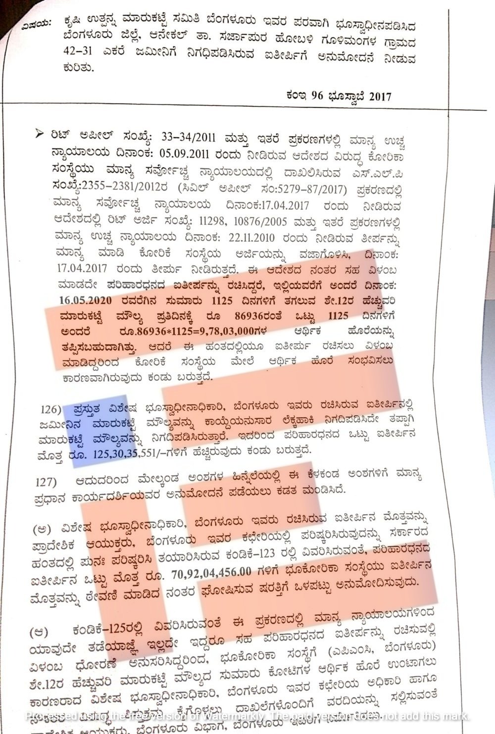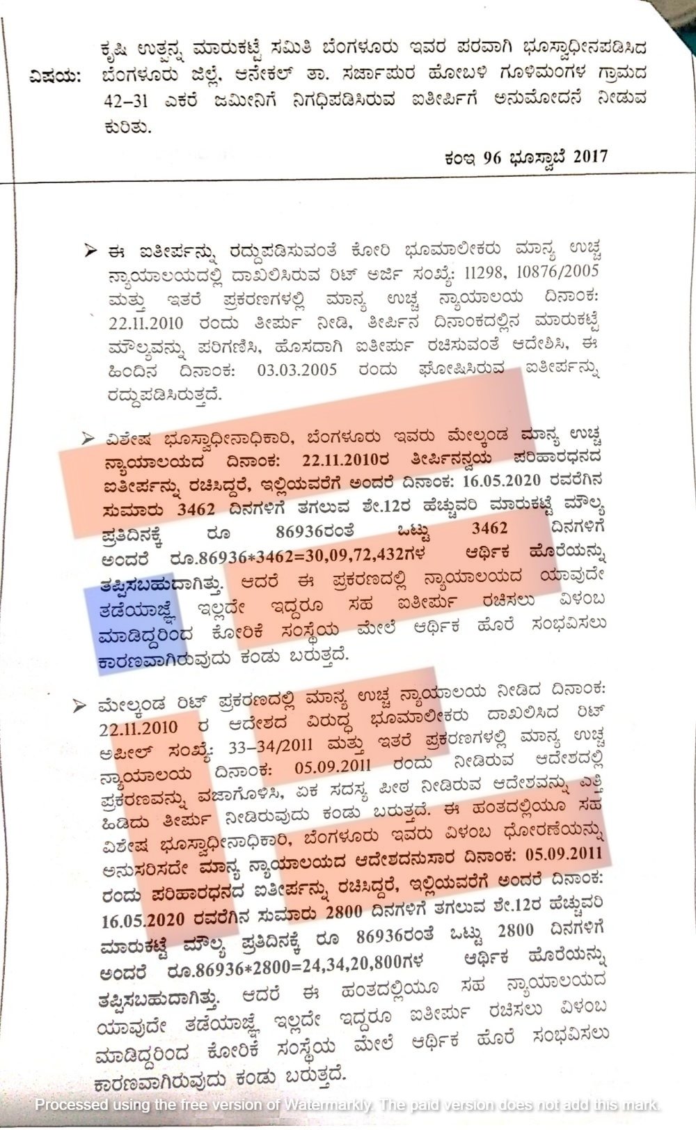 ‘2010ರ ನವೆಂಬರ್‌ 22ರಂದು ಹೈಕೋರ್ಟ್‌ ನೀಡಿದ್ದ ತೀರ್ಪಿನ ಪ್ರಕಾರ ವಿಶೇಷ ಭೂ ಸ್ವಾಧೀನಾಧಿಕಾರಿ ಪರಿಹಾರ ಧನದ ಐ ತೀರ್ಪನ್ನು ರಚಿಸಿದ್ದರೆ 2020ರ ಮೇ 16ರವರೆಗಿನ(ಪ್ರತಿ ದಿನಕ್ಕೆ 86,936 ರಂತೆ) ಒಟ್ಟು 3462 ದಿನಗಳಿಗೆ ತಗಲುವ ಶೇ.12ರ ಹೆಚ್ಚುವರಿ ಮಾರುಕಟ್ಟೆ ಮೌಲ್ಯ 30,09,72,432 ರು.ಗಳ ಆರ್ಥಿಕ ಹೊರೆಯನ್ನು ತಪ್ಪಿಸಬಹುದಾಗಿತ್ತು,’ ಎಂಬ ಅಂಶ ಟಿಪ್ಪಣಿ ಹಾಳೆಯಿಂದ ತಿಳಿದು ಬಂದಿದೆ.