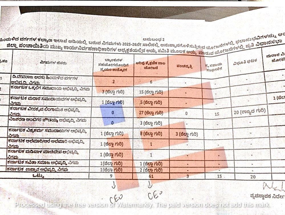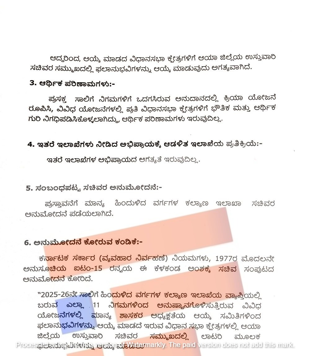 2025-26ನೇ ಸಾಲಿಗೆ ಹಿಂದುಳಿದ ವರ್ಗಗಳ ಕಲ್ಯಾಣ ಇಲಾಖೆಯ ವ್ಯಾಪ್ತಿಯಲ್ಲಿ ಬರುವ ಎಲ್ಲಾ 11 ನಿಗಮಗಳಿಂದ ಅನುಷ್ಠಾನಗೊಳಿಸುತ್ತಿರುವ ವಿವಿಧ ಯೋಜನೆಗಳಲ್ಲಿ ಶಾಸಕರ ಅಧ್ಯಕ್ಷತೆಯ ಆಯ್ಕೆ ಸಮಿತಿಗಳಿಂದ ಫಲಾನುಭವಿಗಳನ್ನು ಆಯ್ಕೆ ಮಾಡದೇ ಇರುವ ವಿಧಾನಸಭೆ ಕ್ಷೇತ್ರಗಳಲ್ಲಿ ಆಯಾ ಜಿಲ್ಲೆಯ ಉಸ್ತುವಾರಿ ಸಚಿವರ ಸಮ್ಮುಖದಲ್ಲಿ ಲಾಟರಿ ಮೂಲಕ ಫಲಾನುಭವಿಗಳನ್ನು ಆಯ್ಕೆ ಮಾಡಲು ಅನುಮೋದನೆ ಕೋರಿರುವುದು ಟಿಪ್ಪಣಿ ಹಾಳೆಯಿಂದ ತಿಳಿದು ಬಂದಿದೆ.