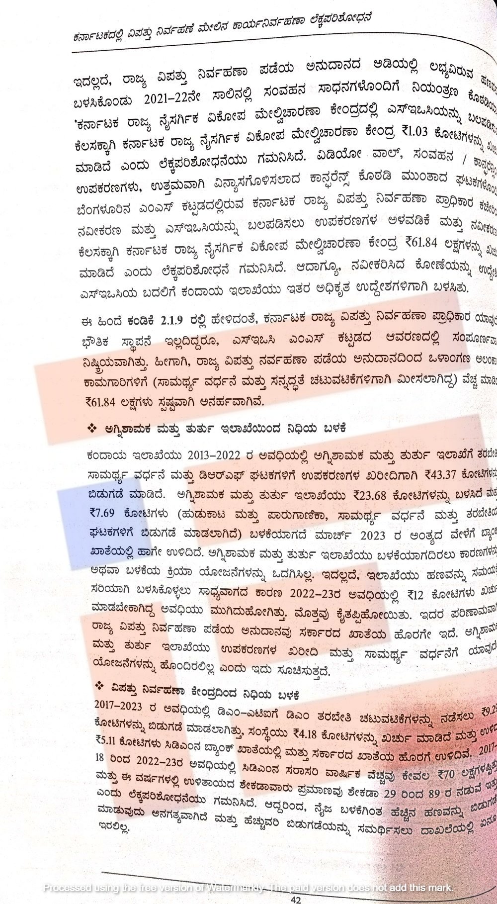 ಈ ಹಣದಲ್ಲಿ ವಿಡಿಯೋ ವಾಲ್, ಸಂವಹನ, ಸಭಾಂಗಣ ಉಪಕರಣಗಳು, ಬೆಂಗಳೂರಿನ ಬಹುಮಹಡಿ ಕಟ್ಟಡದಲ್ಲಿರುವ ಕರ್ನಾಟಕ ರಾಜ್ಯ ವಿಪತ್ತು ನಿರ್ವಹಣಾ ಪ್ರಾಧಿಕಾರ ಕಚೇರಿಯ ನವೀಕರಣ, ಎಸ್ಇಒಸಿ ಬಲಪಡಿಸಲು ಉಪಕರಣಗಳ ಅಳವಡಿಕೆ ಮತ್ತು ನವೀಕರಣಕ್ಕಾಗಿ 61.84 ಲಕ್ಷ ರುಗ.ಳನ್ನು ಖರ್ಚು ಮಾಡಿದೆ. ಮತ್ತು ನವೀಕರಿಸಿದ್ದ ಕೋಣೆಯನ್ನು ಕಂದಾಯ ಇಲಾಖೆಯು ಅನ್ಯ ಉದ್ದೇಶಗಳಿಗೆ ಬಳಸಿರುವುದನ್ನು ಲೆಕ್ಕ ಪರಿಶೋಧನೆಯು ಗಮನಿಸಿದೆ.