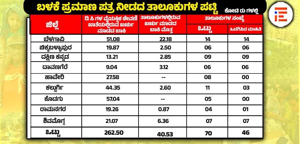 ಬೆಳಗಾವಿ ಜಿಲ್ಲೆಯ ಜಿಲ್ಲಾಧಿಕಾರಿಗಳ ವೈಯಕ್ತಿಕ ಠೇವಣಿ ಖಾತೆಯಲ್ಲಿ 51.08 ಕೋಟಿ, ತಾಲೂಕು ಕಚೇರಿಗಳಲ್ಲಿ 22.18 ಕೋಟಿ ರು ಸೇರಿ 72.26 ಕೋಟಿಯಷ್ಟು ಬಾಕಿ ಉಳಿದಿತ್ತು. ಚಿಕ್ಕಬಳ್ಳಾಪುರದಲ್ಲಿ ಜಿಲ್ಲಾಧಿಕಾರಿ ಮತ್ತು ತಾಲೂಕು ಕಚೇರಿಗಳಲ್ಲಿ ಒಟ್ಟಾರೆ 22.37 ಕೋಟಿ, ದಕ್ಷಿಣ ಕನ್ನಡದಲ್ಲಿ ಜಿಲ್ಲಾಧಿಕಾರಿ, ತಾಲೂಕು ಕಚೇರಿಗಳಲ್ಲಿ 16.06 ಕೋಟಿ, ದಾವಣಗೆರೆ ಜಿಲ್ಲೆಯಲ್ಲಿ ಜಿಲ್ಲಾಧಿಕಾರಿ, ತಾಲೂಕು ಕಚೇರಿಗಳಲ್ಲಿ 12.16 ಕೋಟಿ, ಹಾವೇರಿ ಜಿಲ್ಲೆಯಲ್ಲಿ ಜಿಲ್ಲಾಧಿಕಾರಿ ಹೆಸರಿನಲ್ಲಿನ ಪಿ ಡಿ ಖಾತೆಯಲ್ಲಿ 27.58 ಕೋಟಿ ಬಾಕಿ ಉಳಿದಿತ್ತು.