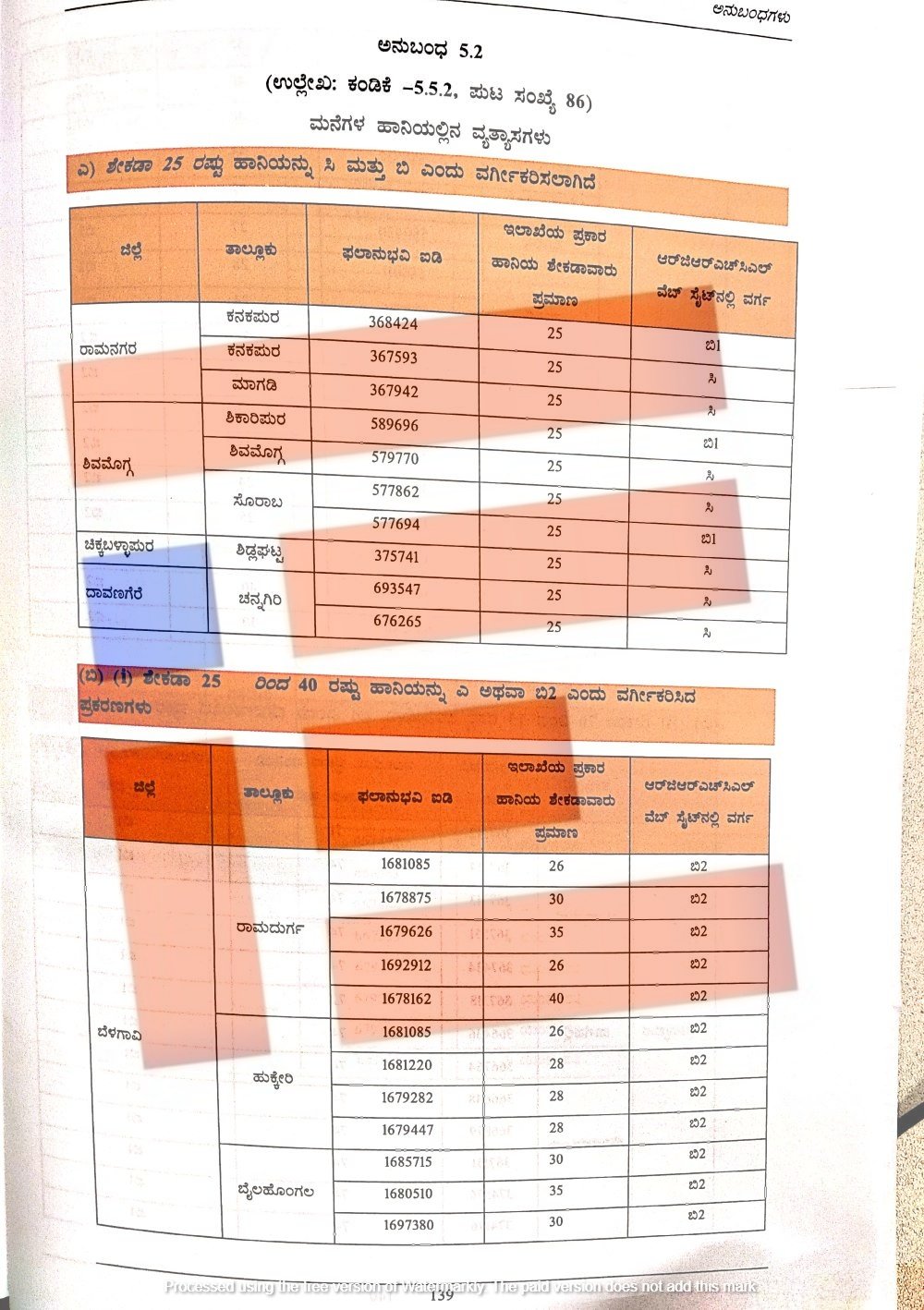 ರಾಮನಗರ ಜಿಲ್ಲೆಯ ಕನಕಪುರ ತಾಲೂಕಿನ ಫಲಾನುಭವಿಗೆ (ಐಡಿ 368424, 367593) ಇಲಾಖೆಯ ಪ್ರಕಾರ ಶೇ 25ರಷ್ಟು ಹಾನಿ ಸಂಭವಿಸಿದೆ. ಆದರೆ ಆರ್ಜಿಆರ್ಎಚ್ಸಿಎಲ್ ವೆಬ್ಸೈಟ್ನಲ್ಲಿ ಇದನ್ನು ಬಿ 1 ಮತ್ತು ಸಿ ಎಂದು ವರ್ಗೀಕರಿಸಿದೆ. ಅದೇ ರೀತಿ ಮಾಗಡಿ ತಾಲೂಕಿನಲ್ಲಿ ಫಲಾನುಭವಿಯೊಬ್ಬರಿಗೆ (ಐ ಡಿ 367942) ಇಲಾಖೆ ಪ್ರಕಾರ ಶೇ.25ರಷ್ಟು ಹಾನಿ ಸಂಭವಿಸಿದೆ. ಆದರೆ ಆರ್ಜಿಆರ್ಎಚ್ಸಿಎಲ್ ವೆಬ್ಸೈಟ್ನಲ್ಲಿ ಸಿ ವರ್ಗ ಎಂದು ಮಾಡಲಾಗಿದೆ.