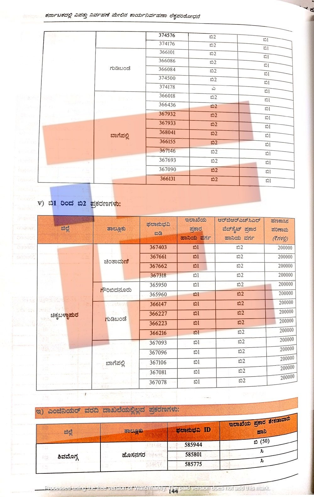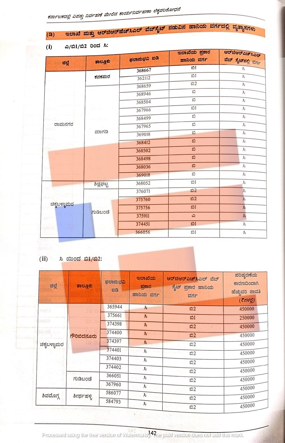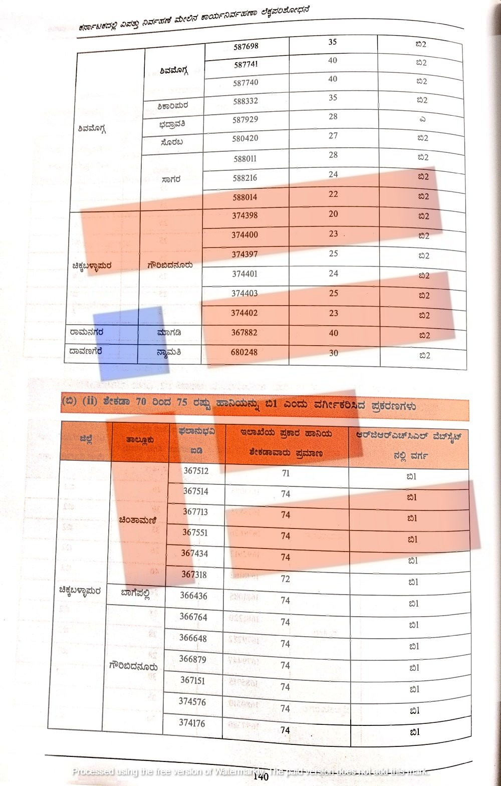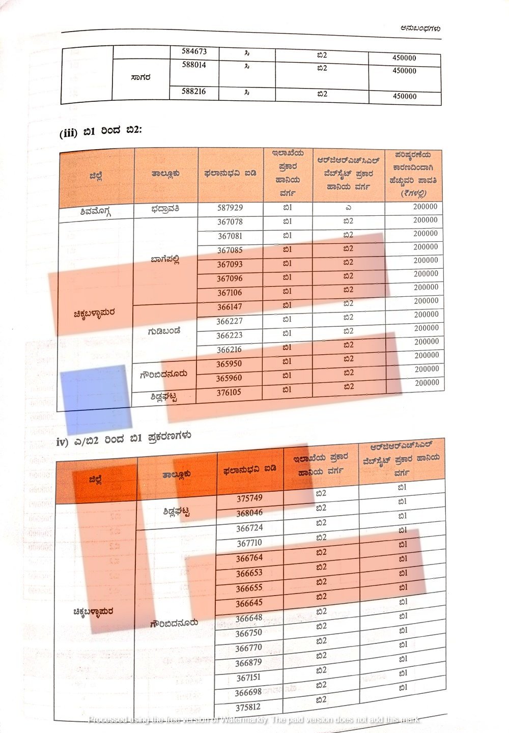 ಅದೇ ರೀತಿ ಚಿಕ್ಕಬಳ್ಳಾಪುರದ ಚಿಂತಾಮಣಿ ತಾಲೂಕಿನಲ್ಲಿ ಫಲಾನುಭವಿಗಳಿಗೆ (ಐ ಡಿ 367512, 367514, 367713, 367551, 367434,367318) ಬಾಗೇಪಲ್ಲಿಯಲ್ಲಿ ಫಲಾನುಭವಿಗೆ ( ಐ ಡಿ 366436), ಗೌರಿಬಿದನೂರಿನಲ್ಲಿ ಫಲಾನುಭವಿಗಳಿಗೆ ( ಐ ಡಿ 366764, 366648, 366879,367151,374576,374176) ಇಲಾಖೆ ಪ್ರಕಾರ ಶೇ. 71ರಿಂದ ಶೇ. 74ರವರೆಗೆ ಹಾನಿಯಾಗಿತ್ತು. ಆದರೆ ಆರ್ಜಿಆರ್ಎಚ್ಸಿಎಲ್ ನ ವೆಬ್ಸೈಟ್ನಲ್ಲಿ ಈ ಪ್ರಕರಣಗಳನ್ನೂ ಬಿ 1 ಎಂದು ವರ್ಗೀಕರಿಸಿದೆ.