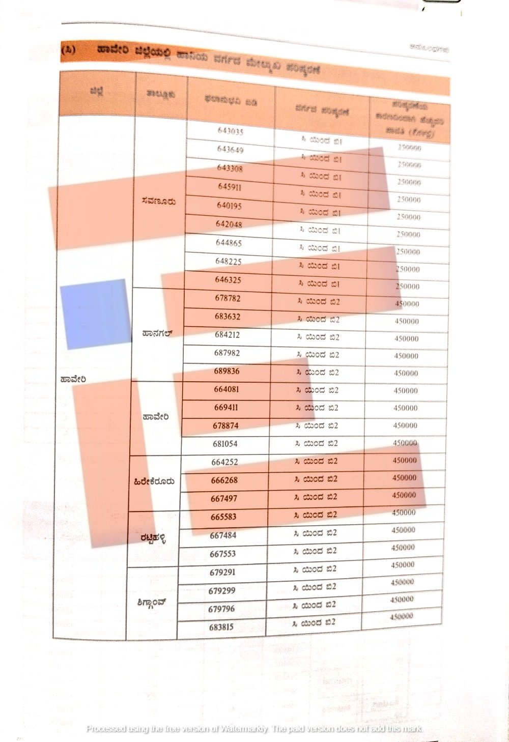 ಹಾವೇರಿ ಜಿಲ್ಲೆಯ ಸವಣೂರು, ಹಾನಗಲ್, ಹಾವೇರಿ, ಹಿರೇಕೆರೂರು, ರಟ್ಟಿಹಳ್ಳಿ, ಶಿಗ್ಗಾಂವ್ನಲ್ಲಿ 28 ಫಲಾನುಭವಿಗಳಿಗೆ ಸಿ ಯಿಂದ ಬಿ 2 ಗೆ ವರ್ಗವನ್ನು ಪರಿಷ್ಕರಣೆ ಮಾಡಿರುವುದರಿಂದ ಹೆಚ್ಚುವರಿಯಾಗಿ ತಲಾ 2,50,000, 4,50,000 ರು ವರೆಗೆ ಪರಿಹಾರ ನೀಡಿದಂತಾಗಿದೆ. ಒಟ್ಟಾರೆ 1.08 ಕೋಟಿಯಷ್ಟು ಹೆಚ್ಚುವರಿಯಾಗಿ ಪರಿಹಾರ ನೀಡಿದಂತಾಗಿದೆ.