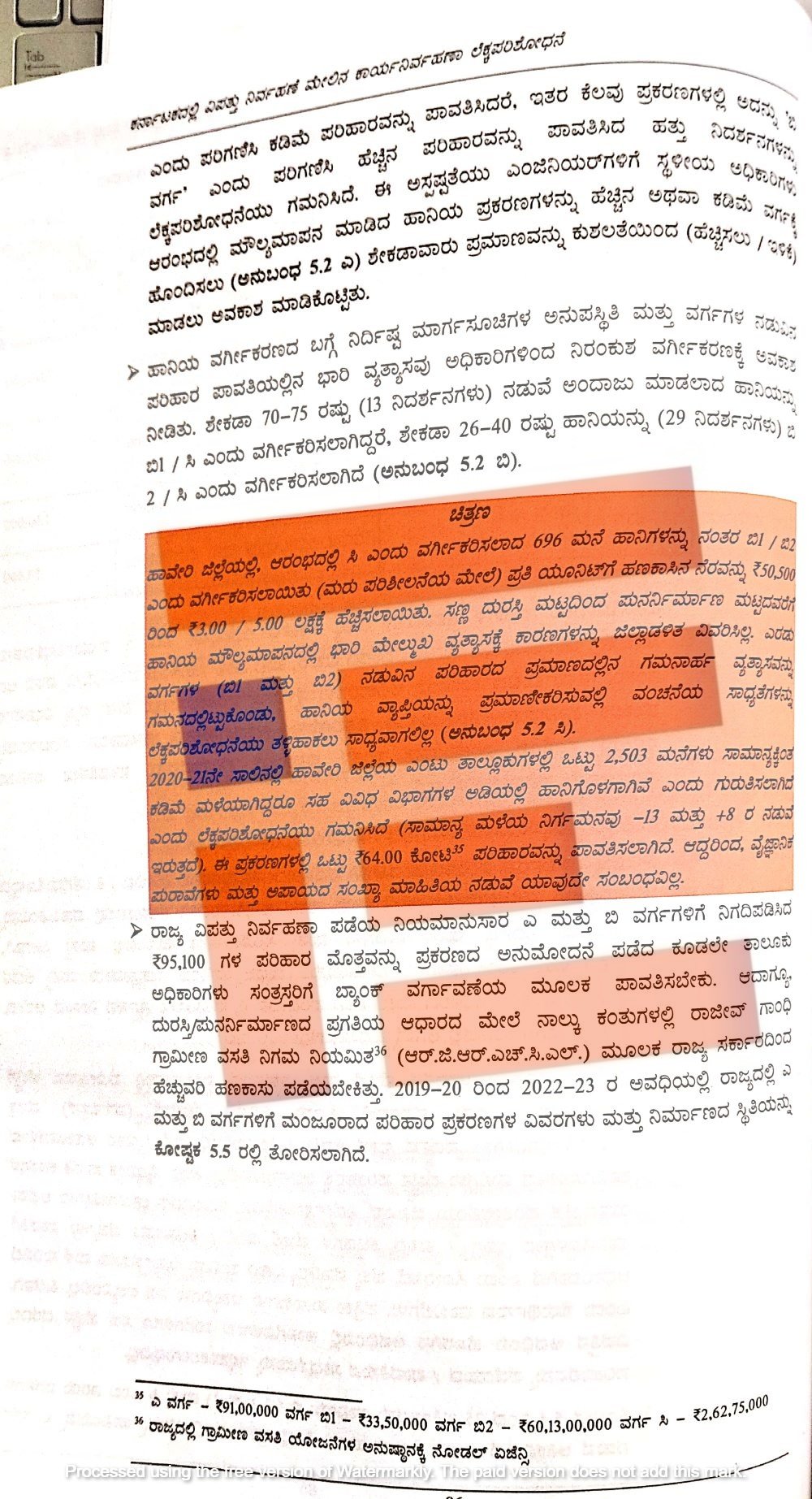 ಕೆಲವು ಪ್ರಕರಣಗಳಲ್ಲಿ ಶೇ. 25ರಷ್ಟು ಹಾನಿಯನ್ನು ಸಿ ವರ್ಗ ಎಂದು ಪರಿಗಣಿಸಿ ಕಡಿಮೆ ಪರಿಹಾರ ಪಾವತಿಸಿದೆ. ಇತರ ಕೆಲವು ಪ್ರಕರಣಗಳಲ್ಲಿ ಅದನ್ನು ಬಿ ವರ್ಗ ಎಂದು ಪರಿಗಣಿಸಿ ಹೆಚ್ಚಿನ ಪರಿಹಾರ ಪಾವತಿಸಿದ ಹತ್ತು ನಿದರ್ಶನಗಳನ್ನು ಲೆಕ್ಕ ಪರಿಶೋಧನೆಯು ಗಮನಿಸಿದೆ.