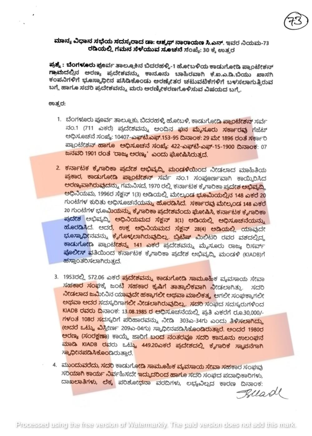 ಬೆಂಗಳೂರು ಪೂರ್ವ ತಾಲೂಕಿನ ಬಿದರಹಳ್ಳಿ-1 ಹೋಬಳಿಯ ಕಾಡುಗೋಡಿ ಪ್ಲಾಂಟೇಷನ್ ಗ್ರಾಮದಲ್ಲಿನ ಅರಣ್ಯ ಪ್ರದೇಶವನ್ನು ಕಾನೂನುಬಾಹಿರವಾಗಿ ಕೆಐಎಡಿಬಿಯು ಖಾಸಗಿ ಕಂಪನಿಗಳಿಗೆ ಭೂ ಸ್ವಾಧೀನಪಡಿಸಿಕೊಂಡು ಅರಣ್ಯೇತರ ಚಟುವಟಿಕೆಗಳಿಗೆ ಬಳಸಲಾಗುತ್ತಿರುವುದು ಮತ್ತು ಈ ಪ್ರದೇಶವನ್ನು ಮರು ಅರಣ್ಯೀಕರಣಗೊಳಿಸುವ ಕುರಿತು ಬಿಜೆಪಿ ಸದಸ್ಯ ಡಾ ಅಶ್ವಥ್ ನಾರಾಯಣ್ ಅವರು ನಿಯಮ 73ರಡಿ ಮಂಡಿಸಿದ್ದ ವಿಷಯಕ್ಕೆ ಅರಣ್ಯ ಸಚಿವ ಈಶ್ವರ್ ಖಂಡ್ರೆ ಅವರು ನೀಡಿರುವ ಉತ್ತರದಲ್ಲಿ ಈ ಮಾಹಿತಿ ಇದೆ.