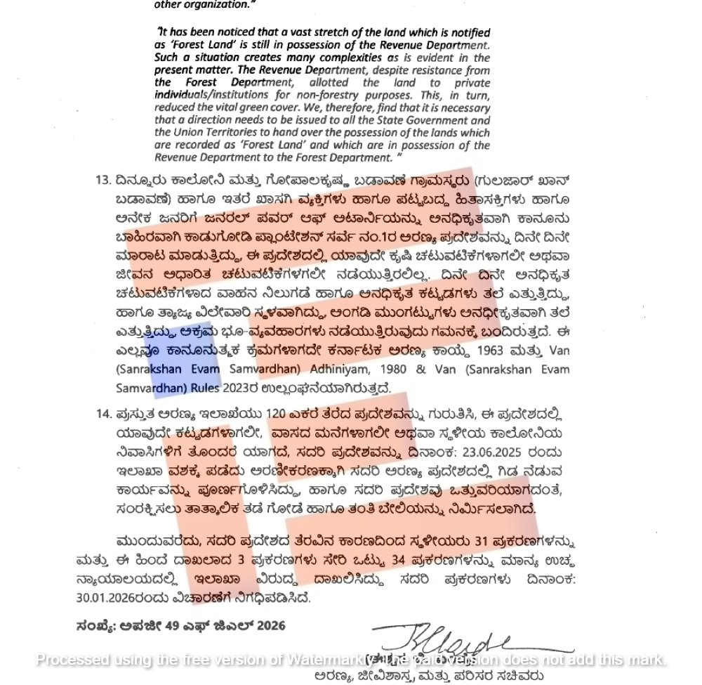 ಬೆಂಗಳೂರು; ಬೆಂಗಳೂರು ನಗರದ ದಿನ್ನೂರು ಕಾಲೋನಿ ಮತ್ತು ಗೋಪಾಲಕೃಷ್ಣ ಬಡಾವಣೆ (ಗುಲ್ಜಾರ್ ಖಾನ್ ಬಡಾವಣೆ) ಹಾಗೂ ಇತರೆ ಖಾಸಗಿ ವ್ಯಕ್ತಿಗಳು, ಪಟ್ಟಭದ್ರ ಹಿತಾಸಕ್ತಿಗಳು ಅನೇಕ ಜನರಿಗೆ ಬೆಂಗಳೂರು ಪೂರ್ವ ತಾಲೂಕಿನ ಬಿದರಹಳ್ಳಿ ಹೋಬಳಿಯ ಕಾಡುಗೋಡಿ ಪ್ಲಾಂಟೇಷನ್ನ ಸರ್ವೆ ನಂ 1ರಲ್ಲಿರುವ ಅರಣ್ಯ ಪ್ರದೇಶವನ್ನು ಕಾನೂನುಬಾಹಿರವಾಗಿ ದಿನೇ ದಿನೇ ಮಾರಾಟ ಮಾಡುತ್ತಿದ್ದಾರೆ ಎಂದು ರಾಜ್ಯ ಸರ್ಕಾರವೇ ಅಧಿಕೃತವಾಗಿ ಒಪ್ಪಿಕೊಂಡಿದೆ.