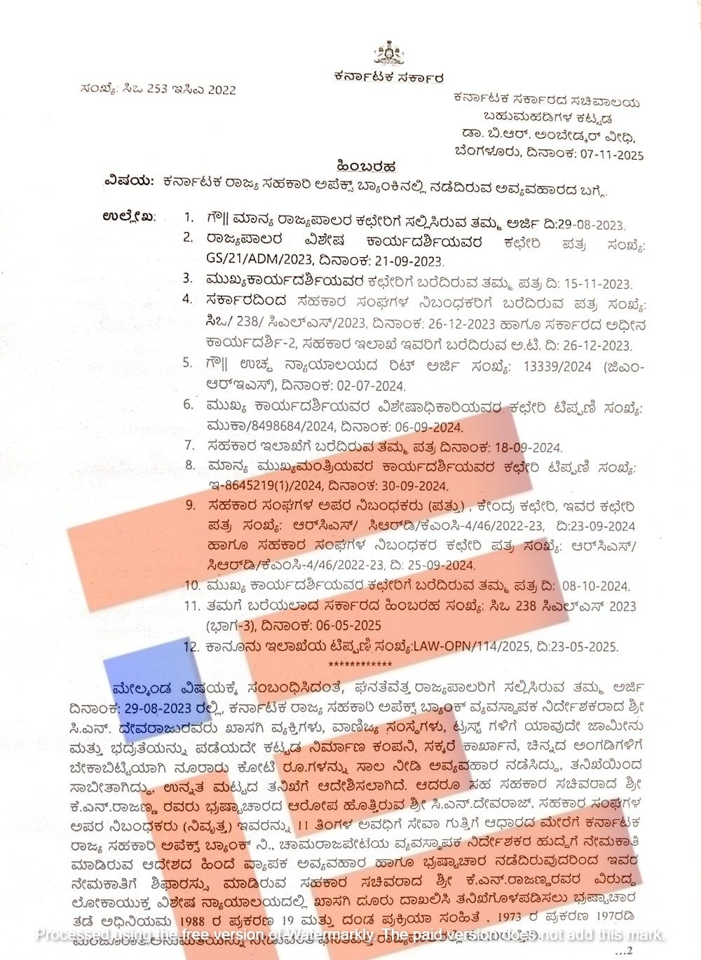ಇದಕ್ಕೆ ಸಂಬಂಧಿಸಿದ ಕಡತವು (ಸಂಖ್ಯೆ; ಸಿಒ 253 ಇಸಿಎ 2022 (ಗಣಕ ಸಂಖ್ಯೆ 897675) 2024ರ ಸೆ.27ರಂದು ರಾಜ್ಯ ಸರ್ಕಾರದ ಮುಖ್ಯ ಕಾರ್ಯದರ್ಶಿಗೆ ರವಾನೆಯಾಗಿತ್ತು. ಆ ನಂತರ ಈ ಕಡತವು ಕಾನೂನು, ಸಂಸದೀಯ ವ್ಯವಹಾರಗಳ ಸಚಿವ ಎಚ್ ಕೆ ಪಾಟೀಲ್ ಅವರ ಪರಿಶೀಲನೆಯಲ್ಲಿತ್ತು ಎಂದು ಸಹಕಾರ ಇಲಾಖೆಯು ದಿನೇಶ್ ಕಲ್ಲಹಳ್ಳಿ ಅವರಿಗೆ 2025ರ ಮೇ 6ರಂದು ಹಿಂಬರಹ ನೀಡಿತ್ತು.