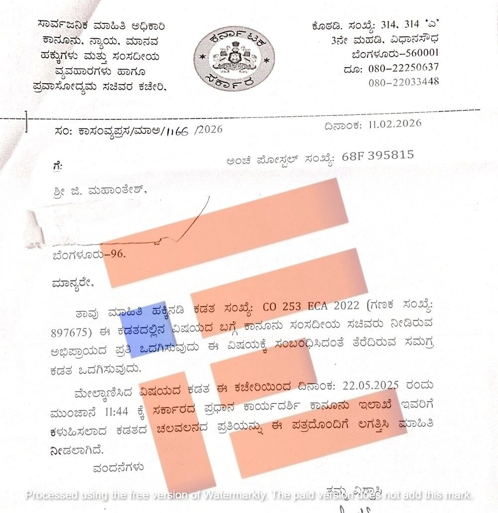 ಈ ಕುರಿತು ‘ದಿ ಫೈಲ್’, ಅರ್ ಟಿ ಐ ಅಡಿ ಕಾನೂನು ಸಚಿವ ಎಚ್ ಕೆ ಪಾಟೀಲ್ ಅವರ ಕಚೇರಿಗೆ ಅರ್ಜಿ ಸಲ್ಲಿಸಿತ್ತು. ಇದಕ್ಕೆ ಮಾಹಿತಿ ನೀಡಿರುವ ಸಚಿವರ ಕಚೇರಿಯು, ಕಾನೂನು ಸಚಿವರು ನೀಡಿರುವ ಅಭಿಪ್ರಾಯವನ್ನು ಒದಗಿಸಿಲ್ಲ. ಬದಲಿಗೆ ಕಡತದ ಚಲನವಲನದ ಮಾಹಿತಿಯನ್ನಷ್ಟೇ ನೀಡಿ ಕೈ ತೊಳೆದುಕೊಂಡಿದೆ.