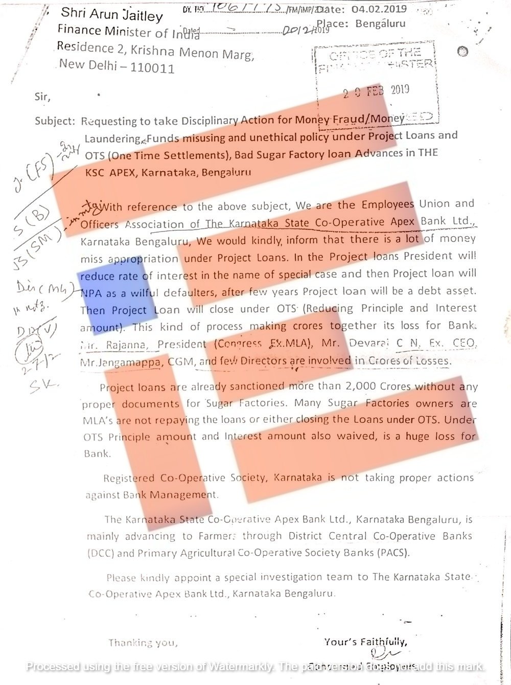 ಸಕ್ಕರೆ ಕಾರ್ಖಾನೆಗಳಿಗೆ ನಿಯಮಬಾಹಿರವಾಗಿ ಸಾಲ ನೀಡಿದೆ ಎಂದು ಅಪೆಕ್ಸ್ ಬ್ಯಾಂಕ್ ಉದ್ಯೋಗಿಗಳು ಮತ್ತು ಅಧಿಕಾರಿಗಳ ಒಕ್ಕೂಟವು ಕೇಂದ್ರ ಹಣಕಾಸು ಸಚಿವಾಲಯ, ನಬಾರ್ಡ್ ಮತ್ತು ಭಾರತೀಯ ರಿಸರ್ವ್ ಬ್ಯಾಂಕ್ಗೆ 2019ರ ಫೆ. 4ರಂದು ದೂರು ಸಲ್ಲಿಸಿತ್ತು. ಈ ದೂರು ಆಧರಿಸಿ ಸೂಕ್ತ ಕ್ರಮ ಕೈಗೊಳ್ಳಬೇಕು ಎಂದು ರಿಸರ್ವ್ಬ್ಯಾಂಕ್, ನಬಾರ್ಡ್ನ ಮುಖ್ಯ ವ್ಯವಸ್ಥಾಪಕರಿಗೆ 2019ರ ಏಪ್ರಿಲ್8 ರಂದು ಪತ್ರ ಮುಖೇನ ಸೂಚಿಸಿದ್ದರು.